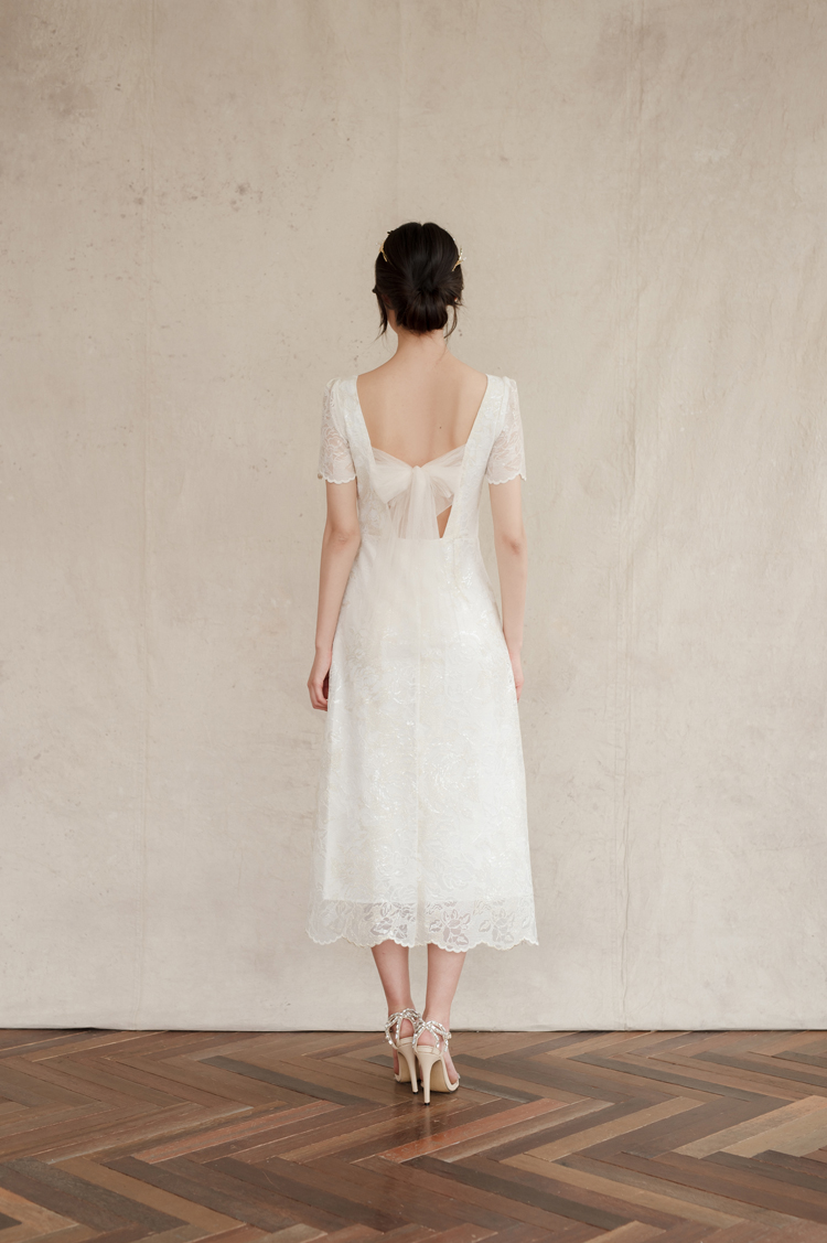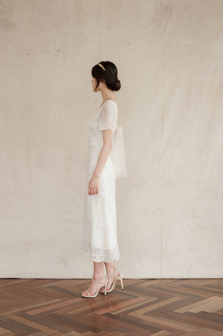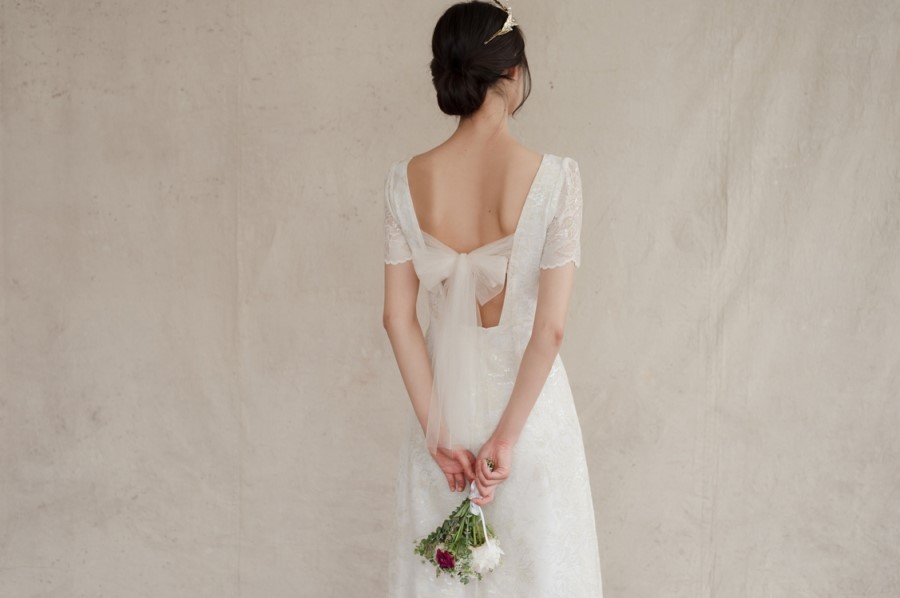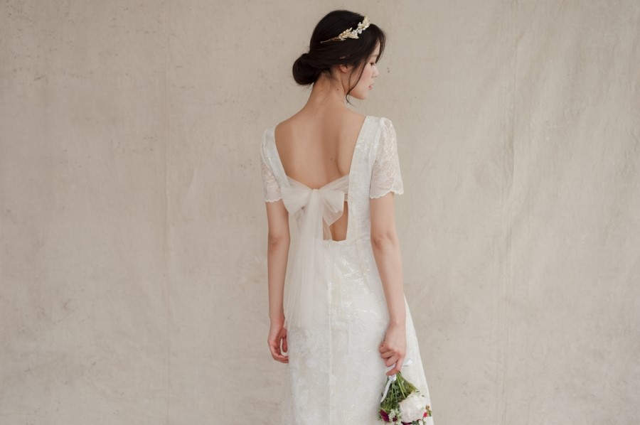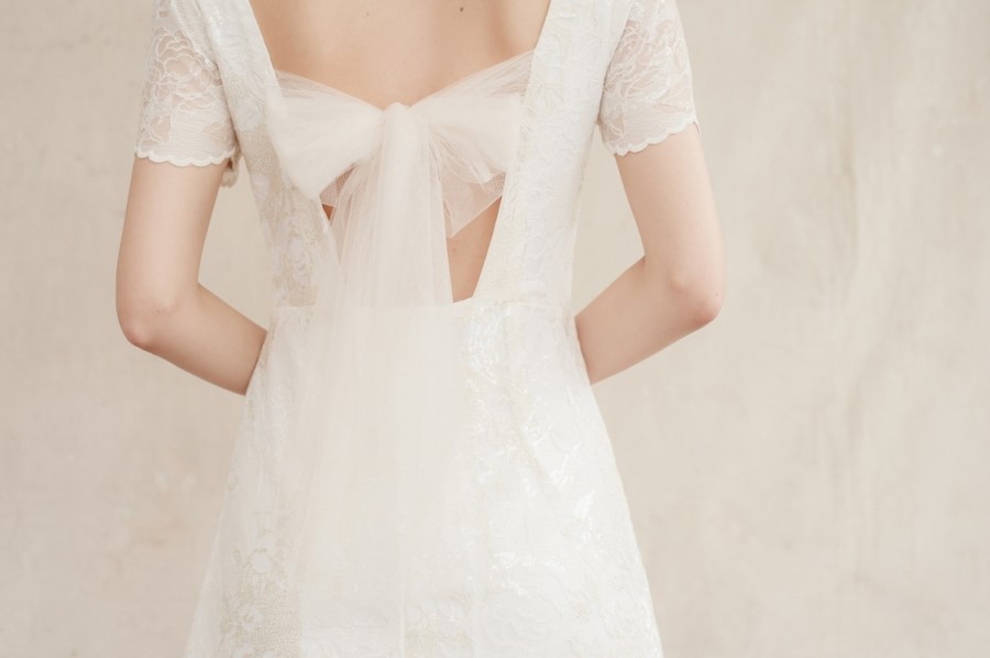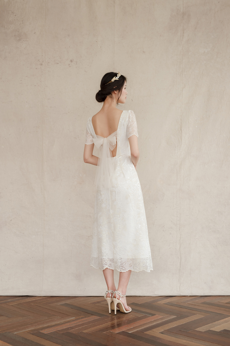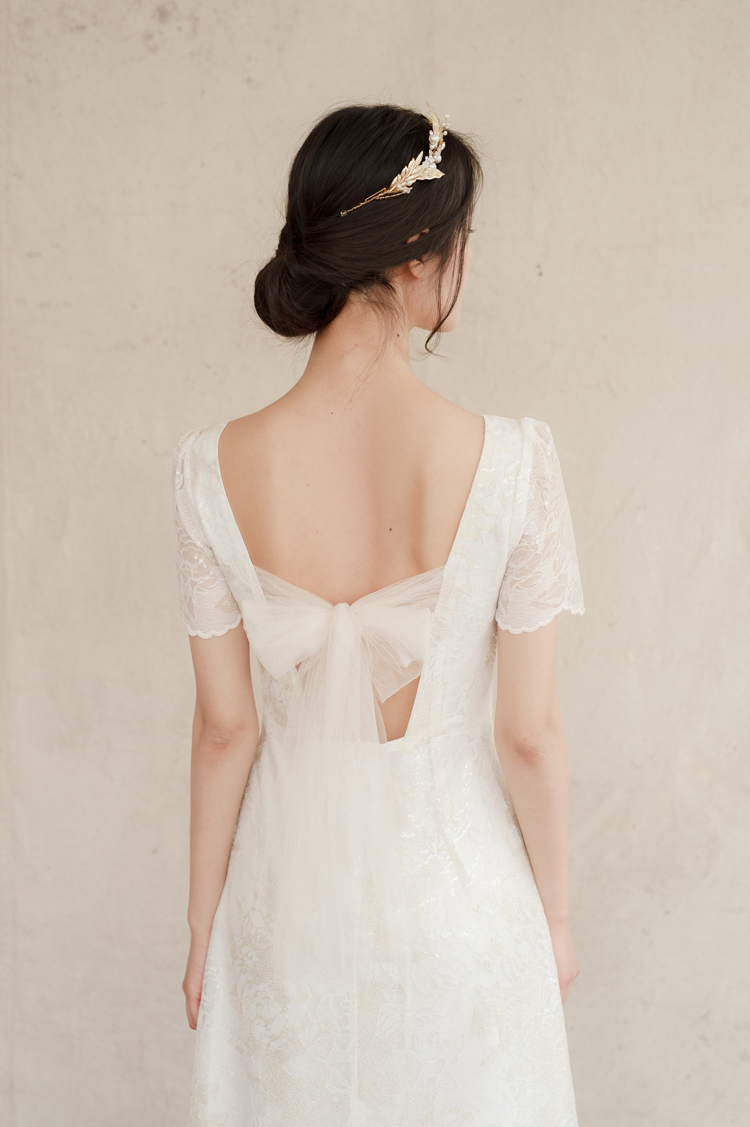 드레스 앞부분은 프린세스 라인으로 날씬한 핏을 보이고, 뒤로는 펄감이 있는 망사 원단으로 리본을 묶어
