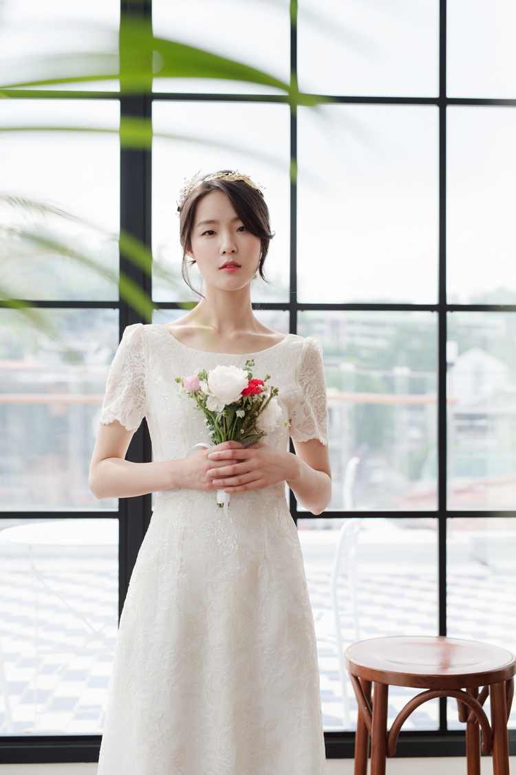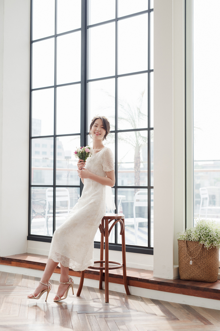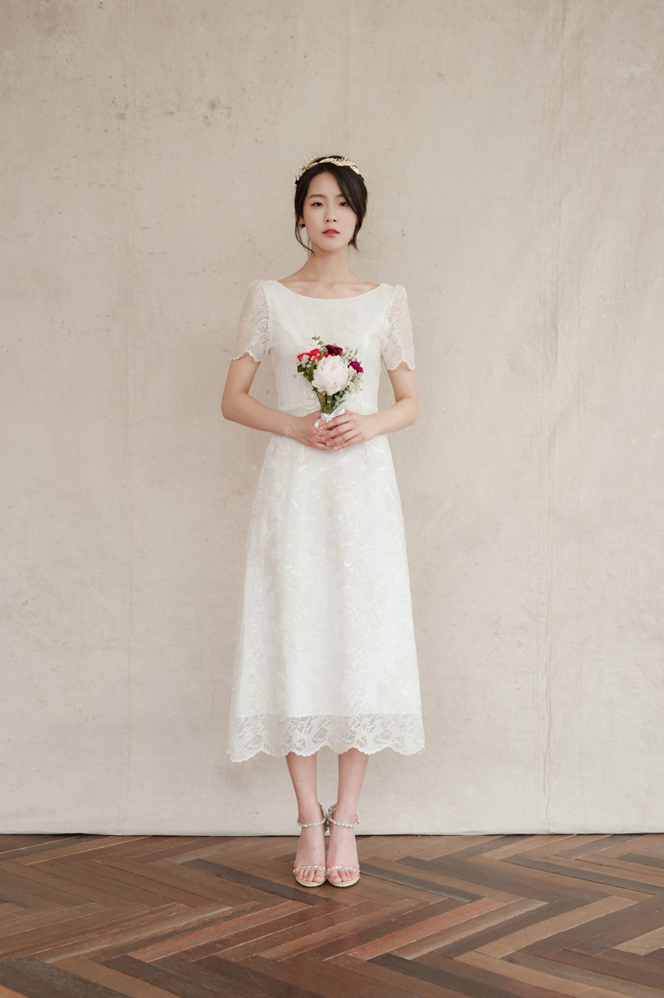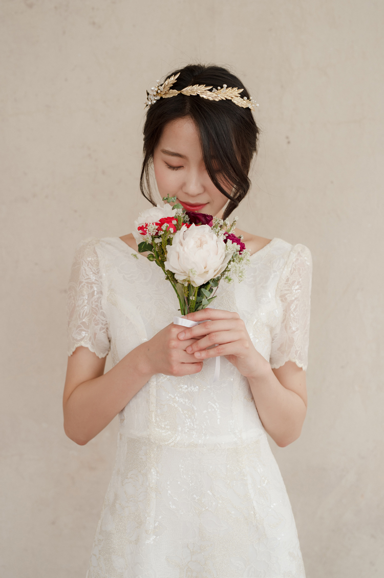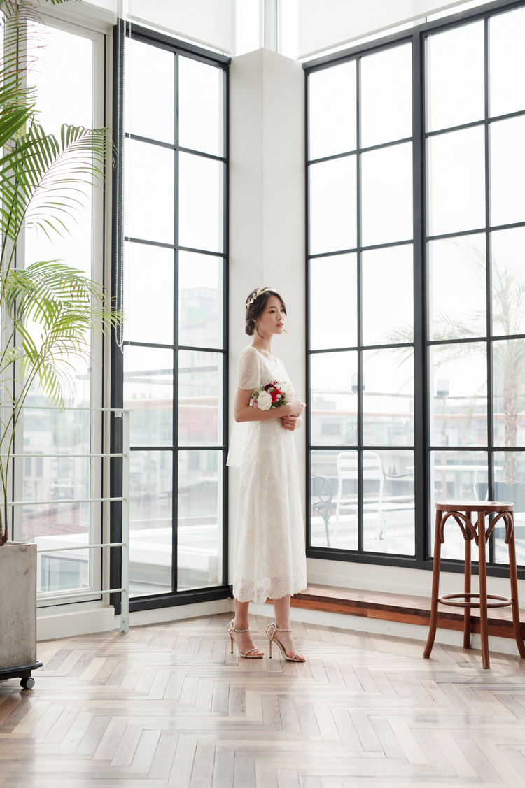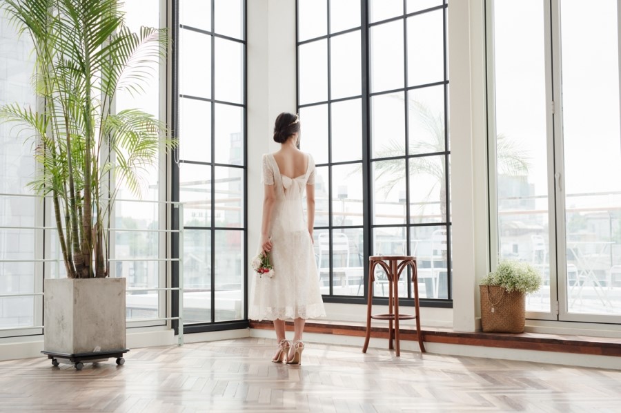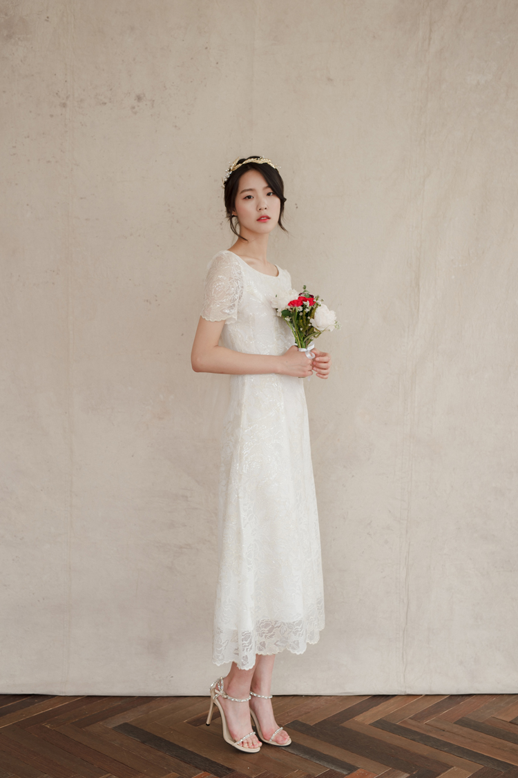 드레스 앞부분은 프린세스 라인으로 날씬한 핏을 보이고, 뒤로는 펄감이 있는 망사 원단으로 리본을 묶어