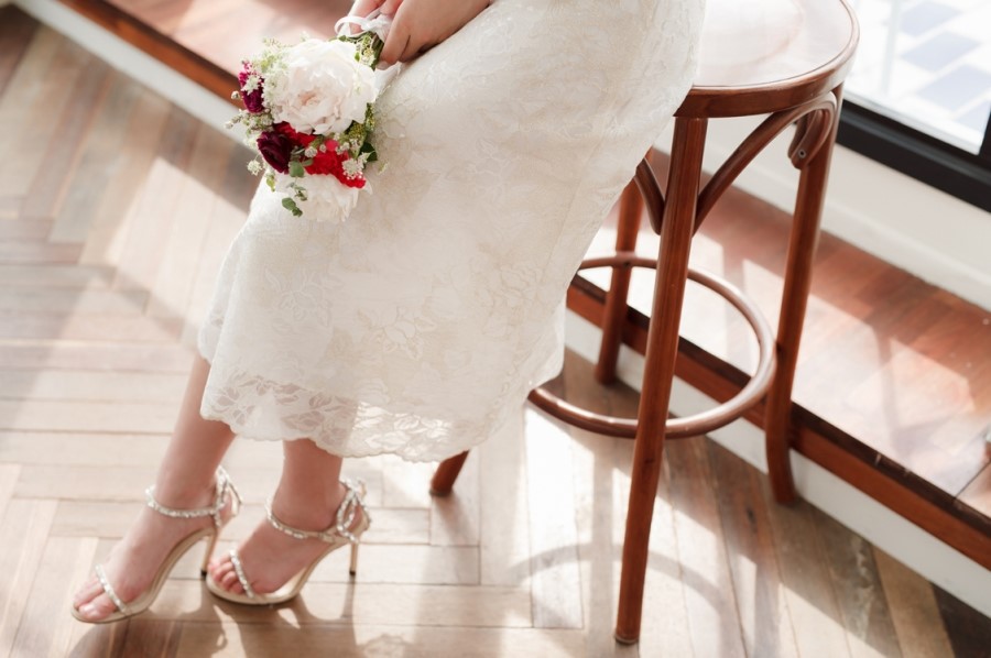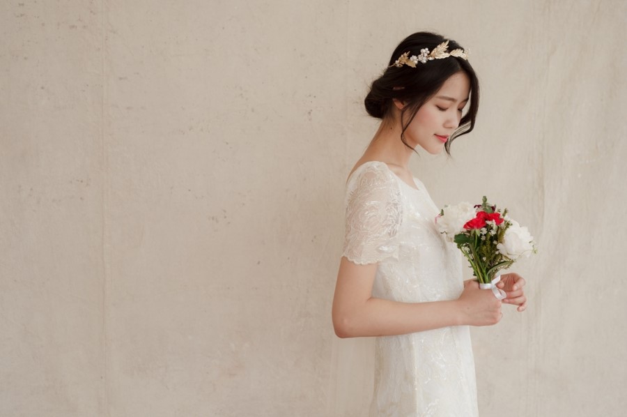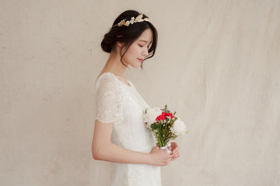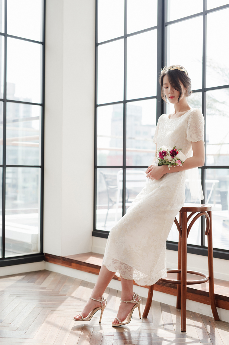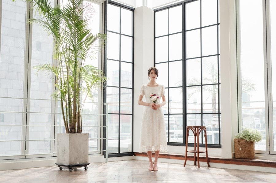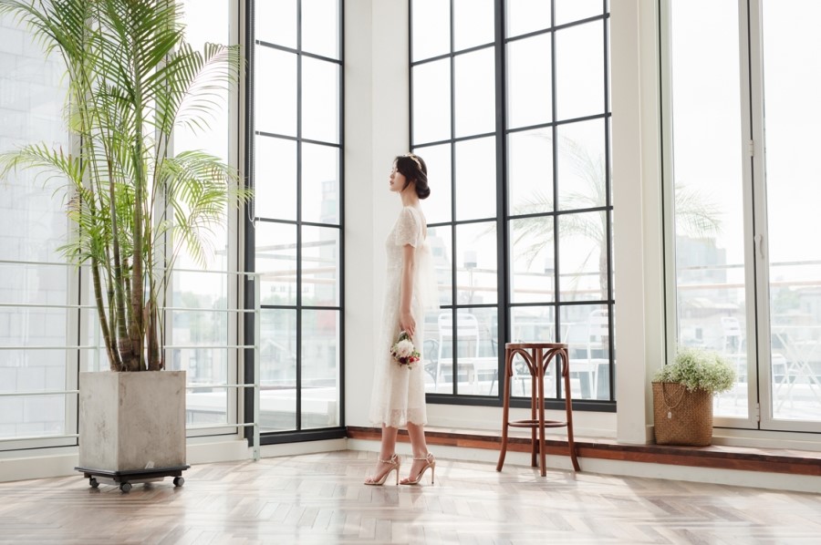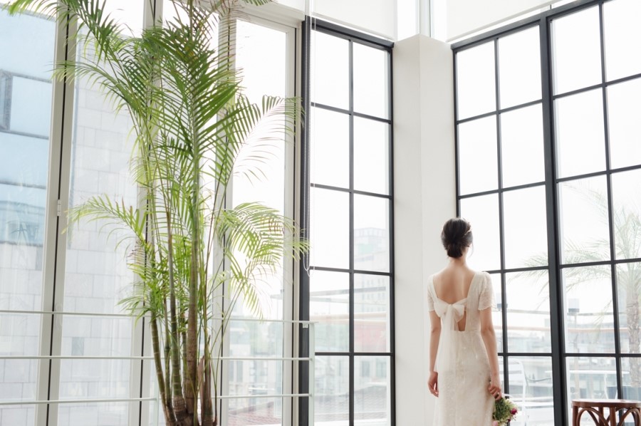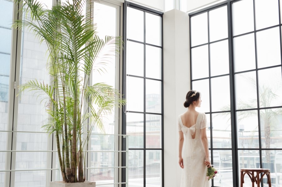 드레스 앞부분은 프린세스 라인으로 날씬한 핏을 보이고, 뒤로는 펄감이 있는 망사 원단으로 리본을 묶어
