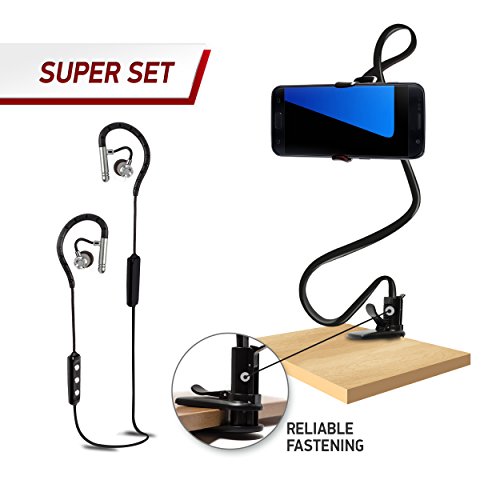-. Feature : FAVORITE MUSIC WITHOUT WIRES: Listen to your music without problems with maximum comfort using wireless headphones by Skyeyeye. Headphones compatible with all devices that support Bluetooth connection. Headphones with Bluetooth version 4.1 provides an ideal sound. / PERFECT SOUND: Headphones by Skyeyeye it's a high definition stereo sound. Feel all the shades of music with earphones, which working on a frequency of 80 Hz - 20 kHz. Special built-in microphone provides clear and quality conversation with your companion by using the noise canceling technology. / BEST QUALITY: Headphones are made of high-quality, non-toxic plastic. Waterproof and sweat resistance make it perfect for running, biking, and training in the Gym. It's an ideal choice for active people. High-quality Bluetooth connection provide a signal range of 10 to 15 meters, it's very useful when you're working. Use our holder with gooseneck arm for your smartphone if your hands are busy or you need a selfie. We provide you a 101 % money back guarantee, it's a purchase without any risk. / STYLISH DESIN AND CONVINUENCE: Headphones are made with modern sports style. Ear Hooks securely hold the headphones while running or sudden movements. Headphones around your neck with user-friendly design are almost invisible. Soft rubber earbuds are very comfortable, which is especially important for long-term use. We offer our headphones and cell phone holder with black color. Our holder for a phone, it's a great tool for watching movies or listening to music on a picnic or a trip. / DEPENDABLE BATTERY: Enjoy your conversation or music during long trips without worrying about the charge level of the battery. Lithium battery will provide you 6 - 8 hours of music or 08 - 10 hours of talking on the phone. Standby condition headphones can hold out up to 720 hours. Total 1.5 hours of charging and your headphones are ready to delight you with your favorite music again.