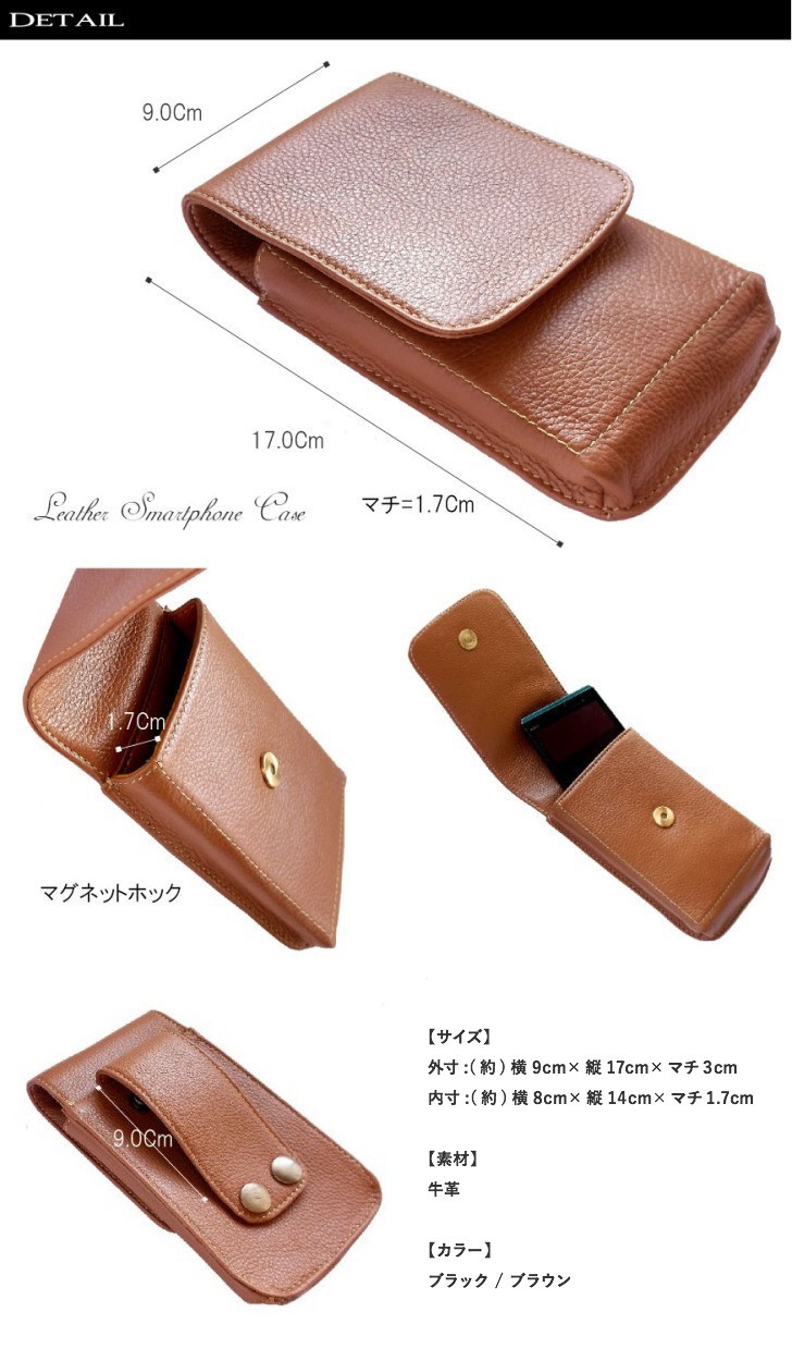 質感の良い牛革/レザーが、高級感を醸し出しています。iPhone7やギャラクシーノートまですっぽりと収まるサイズです。留め具はマグネットホック仕様。 上品な素材と革職人のハンドメイドですが、お手頃価格に収まっておりますので、ギフトやプレゼントでも重宝されます。大事な携帯電話はなくしてはいけません。ちょっとしたお出掛けでも、格好良く持ち運びたいですね♪【サイズ】外寸:(約)ヨコ9cm × タテ16cm × マチ3cm内寸:(約)ヨコ8cm × タテ14cm × マチ1.5cm【素材】牛革【カラー】ブラック / ブラウン【仕様】ベルトループあり