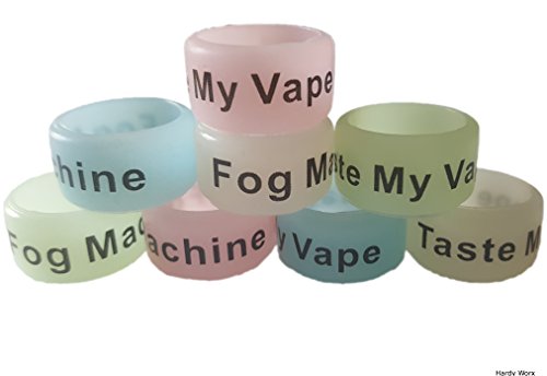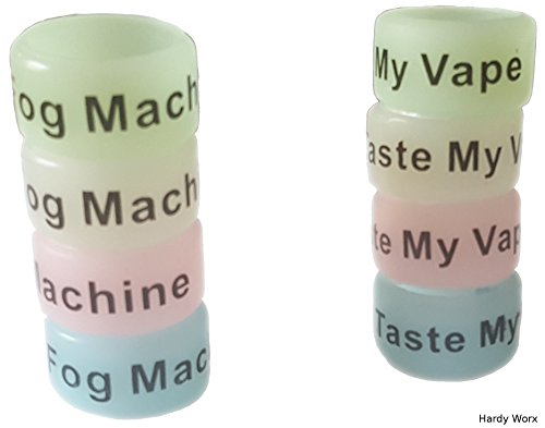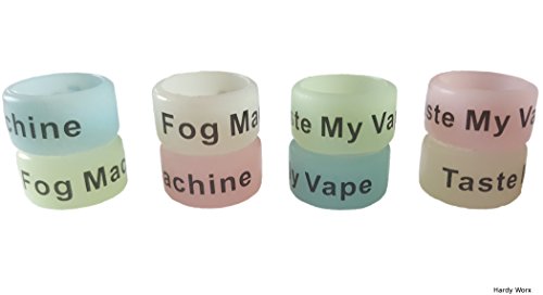 Set includes 8 Vape Band rings. 4 different glow in the dark colors Blue, Yellow, White, and green. you get 2 of each color and each color will say "Fog Machine" or "Taste My Vape". Perfect to Wear as rings.