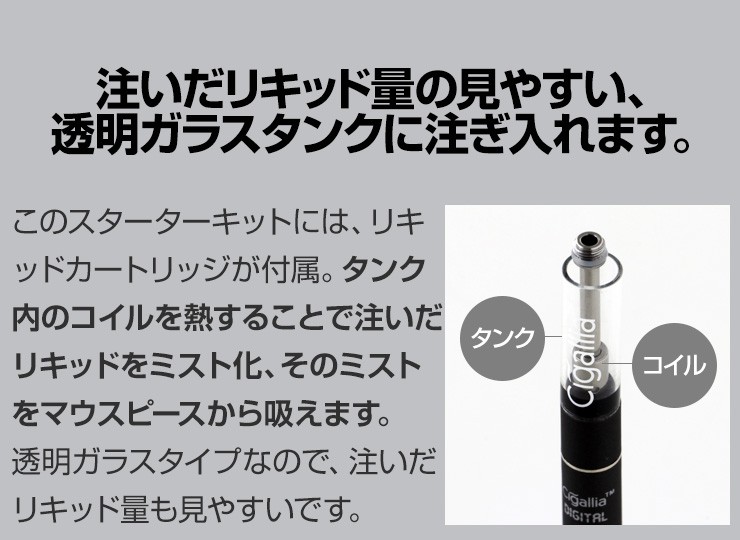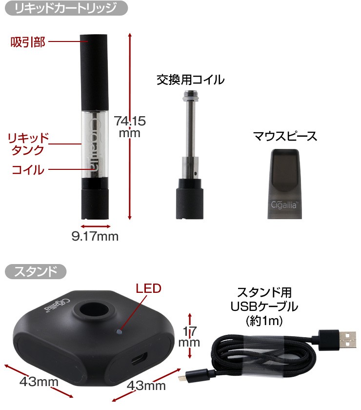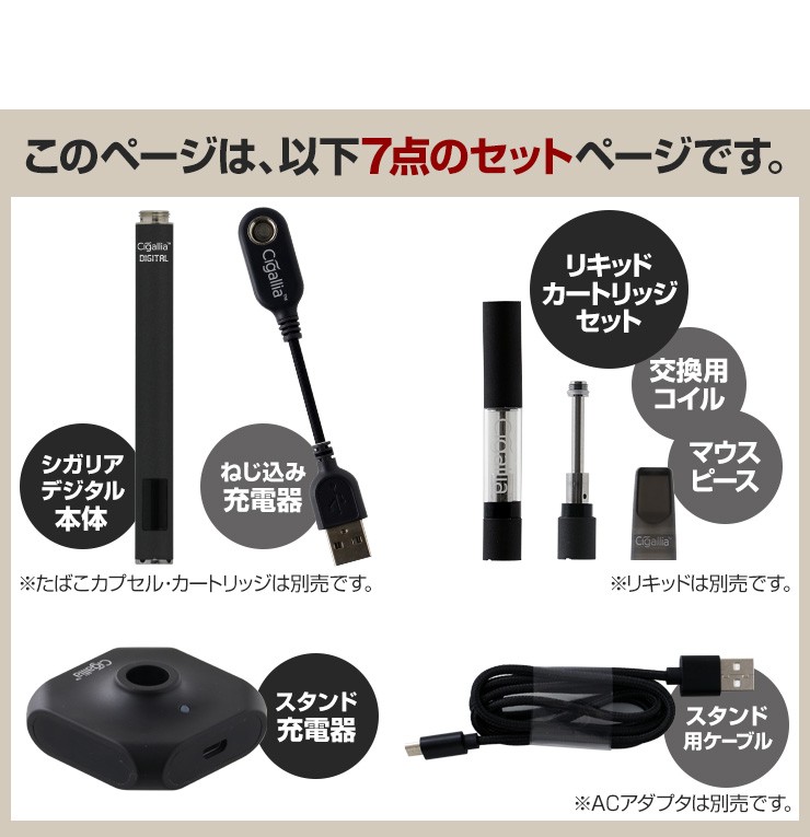 | セット内容 | シガリアデジタルバッテリー本体、ねじ込み充電器、リキッドカートリッジ、交換用(予備)コイル1本、マウスピース、充電スタンド、スタンド用ケーブル |