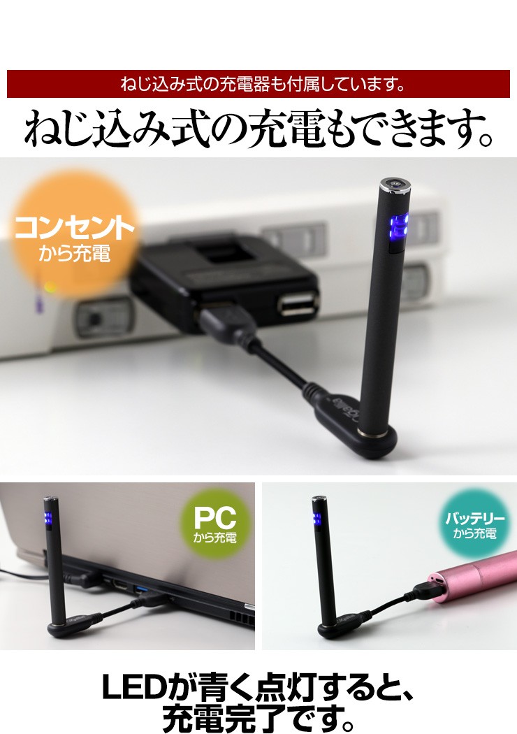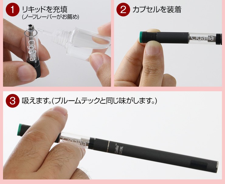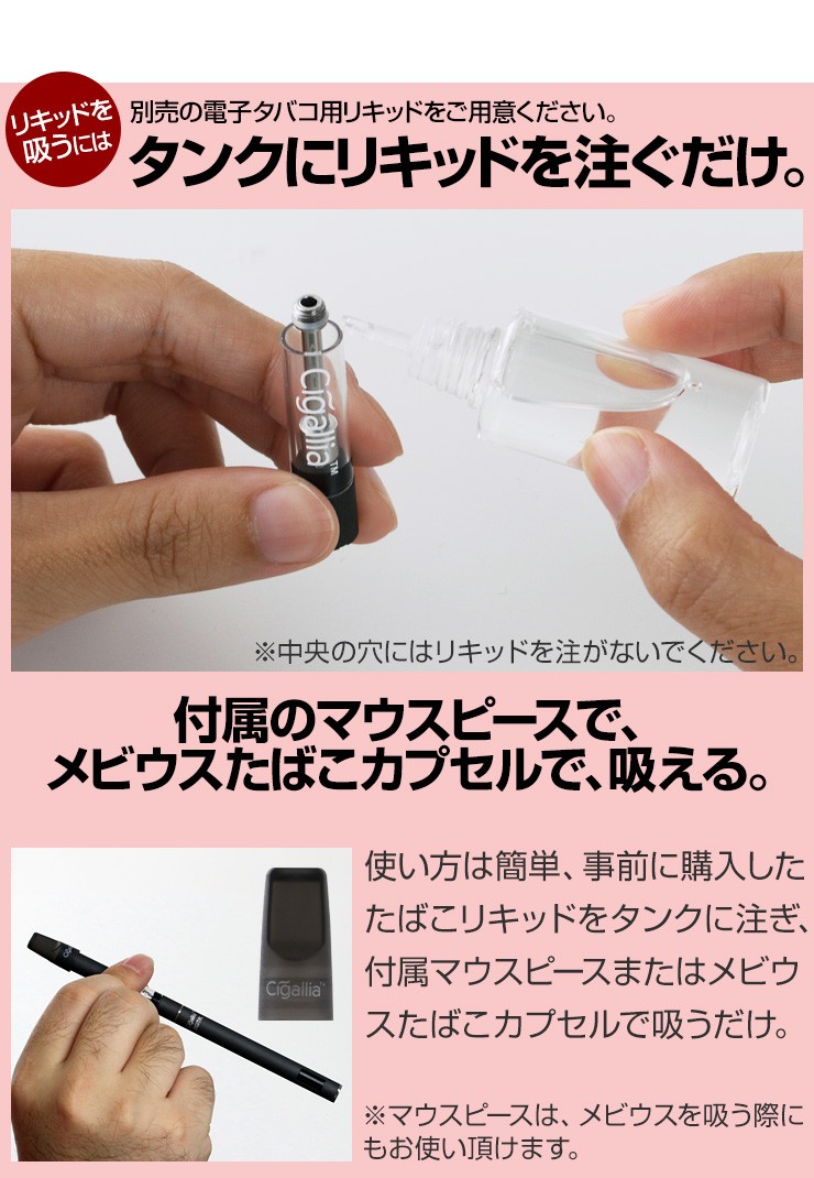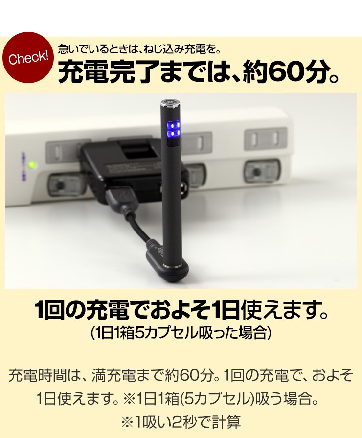 | ご注意事項 | お車のシガーソケット経由で充電を行う際は、必ずエンジンスタート後に接続を行い充電を行ってください。 シガリアとの接続箇所内部にはコイルが内蔵されており、そのコイルでリキッドを加熱し気化したミストを吸うことができます。そのため、リキッドを入れて接続直後は気化が足りずに、十分なミストが出ません。はじめてリキッドを入れる時は、20~30分ほど時間を置き、リキッドが馴染んだあとで吸引をお願いします。 ※コイルのネジ先端に穴が空いていますが、ここにリキッドを入れると故障の原因となります。 ※逆さまの状態で使用すると、コイルが空焼きになり故障の原因となりますのでご注意ください。 ※取扱説明書をよくお読みになりご使用ください。 リキッドカートリッジはガラス製です。 |