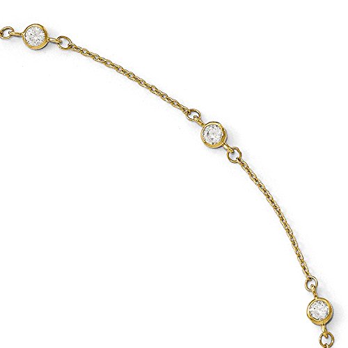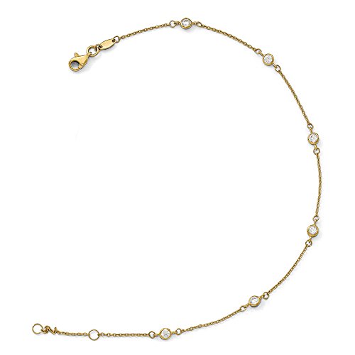 Indulge in a little bling for your leg with a shiny 14k yellow gold adjustable anklet featuring six cubic zirconia station on a 1mm cable chain design that closes with a fancy lobster clasp. It is approximately 4mm in and adjustable from 9 or 10 inches in length.Feature