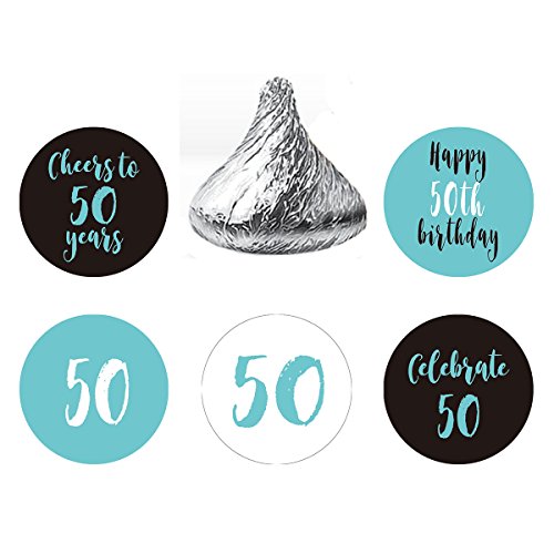 Blue 50th Birthday Party Favors Stickers, Round Candy Labels Fit Hershey’s Kisses, 200 Count