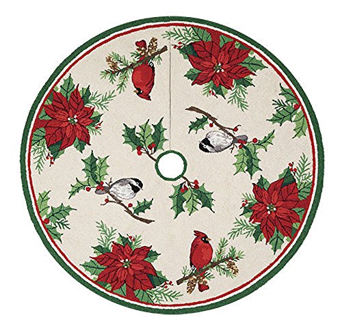 Cardinal, Chickadee and Poinsettia Wool Christmas Hooked Rug Tree Skirt, 52 Inch Round
