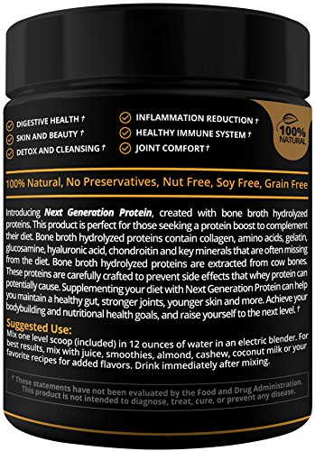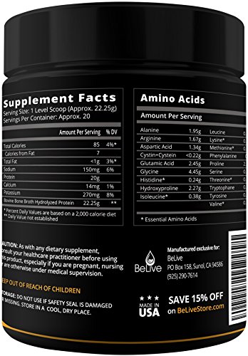 -. Feature : ✔NEXT GENERATION BONE BROTH PROTEIN POWDER: Made from 100% bone broth hydrolyzed proteins with Pasture Raised Cows, Bone Broth Hydrolyzed Protein is one of the healthiest *healing* protein without the side effects. It is perfect for those who can't handle dairy products. It will help treat leaky gut syndrome, tolerate food allergies and prevent potential stomachaches. Bone Broth also possess the benefits of Collagen Peptide as they are two similar components. / ✔EXCLUSIVE BENEFITS: Bone Broth has Glucosamine Chondroitin, Hyaluronic Acid, and Gelatin. Sufficient level of Bone Broth Hydrolyzed Protein is extremely difficult to include into anyone's diet without the proper resources. BeLive's Next Generation Protein is here to provide the finest purified powder packed with Gut Friendly Protein and Amino Acids that can contribute to Healthy Skin, Weight Loss, Inflammation Reduction, Detox and Cleansing, Joint Comfort, and Digestive Health. / ✔CONSUME AT EASE: BeLive's Bone Broth Hydrolyzed Protein powder can be easily mixed with smoothies, protein shake, food, and into drinks without any after taste. Great with almond, cashew, or coconut milk or added to your favorite recipe. *Powder will dissolve better in warm water. / ✔QUALITY VERIFIED: Paleo Friendly, Non-GMO Ingredients, Gluten-Free, Dairy-Free, Nut-Free, Grain-Free, and No Preservatives. / ✔ 100% NATURAL, SAFE & LIFETIME MONEY-BACK GUARANTEED: Made in the USA in an FDA-approved facility, GMP compliant, and quality assurance tested. We place our customers above everything else. We guarantee your satisfaction 100% or else your money back! BeLive's products are entirely risk-free, and we take no shortcuts, so our customers have a peace of mind.