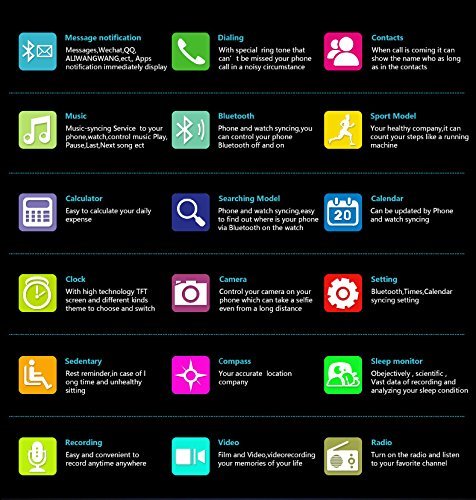 -. Feature : The world's leading German CSR imported chips, perfect Bluetooth Smart technology, smart watches core skills will greatly increase speed transmission, mobile phone and watch,, interactive communication data consolidation, more stable and efficient operation / Unlocked; Band: GSM 850/900/1800/1900 Sim Card: Single SIM Card Single Standby / Function: Messaging, Bluetooth, BT Dialer, camera, Anti-lost, pedometer, Sleep Monitor, Alarm, Calculator, Calendar, FM radio, QQ, vedio recorder, vedio player, image viewer, sound recorder, audio player, etc / To sync SMS or other notifications, android phone needs to install APK / For Andorid phone, every function mentioned can be used, but for IOS iPhone, Remote Camera, Anti-lost, Message and notification can not be used.