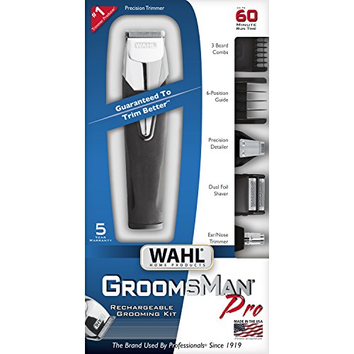The wahl groomsman pro all-in-one rechargeable grooming kit is the most versatile all-in-one rechargeable grooming system. this trimmer is great for head and total body grooming. this grooming kit includes; rechargeable trimmer unit, trimmer head, detail head, dual shaver head, t-blade, 6-position guide, 3 standard trimmer guides, 3 t-blade guides, comb, cleaning brush, blade oil, storage base, charger, and english/spanish instructions/styling guide.Feature