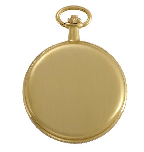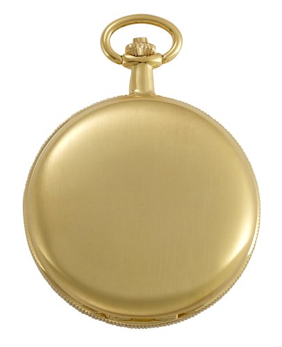 -. Feature : Classic round gold-tone satin finish coin edged 17 jewel mechanical covered pocket watch suitable for engraving / Open cover to expose rich white outer Roman numeral dial with exhibition center / Rich antique style blue cobalt hour, minute and seconds hands plus scratch resistant mineral crystal / Includes matching 15" curb pocket watch chain with sP.R.Ing ring attachment plus solid brass desk top stand / Arrives in beautiful presentation box with Selvyt polishing cloth, lifetime limited warranty and operating instructions