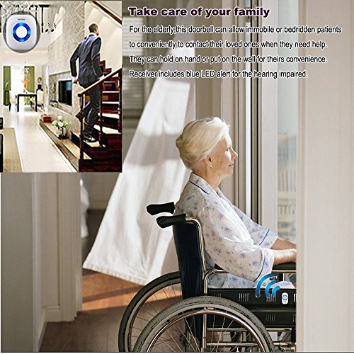 Signal Alert:Take care of your family,for the elderly,this doorbell can allow immobile or bedridden patients to conveniently to contact their loved ones when they need help.They can hold on hand or put on the wall for theirs convenience.Receiver includes blue LED alert for the hearing impaired.