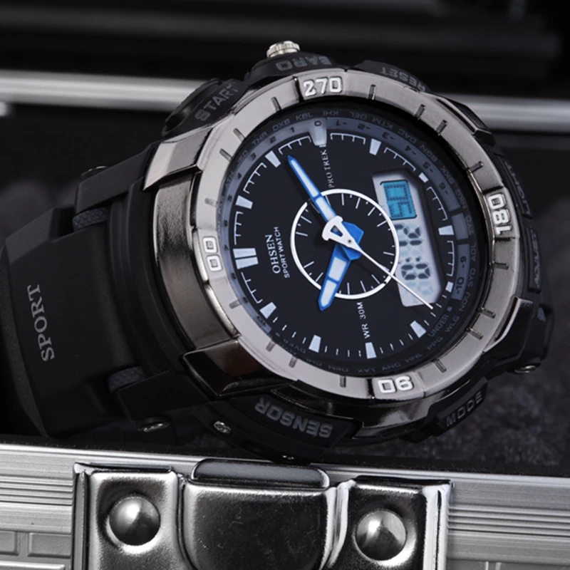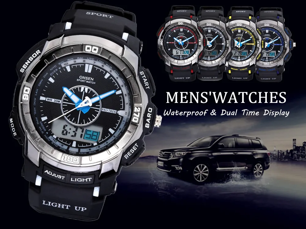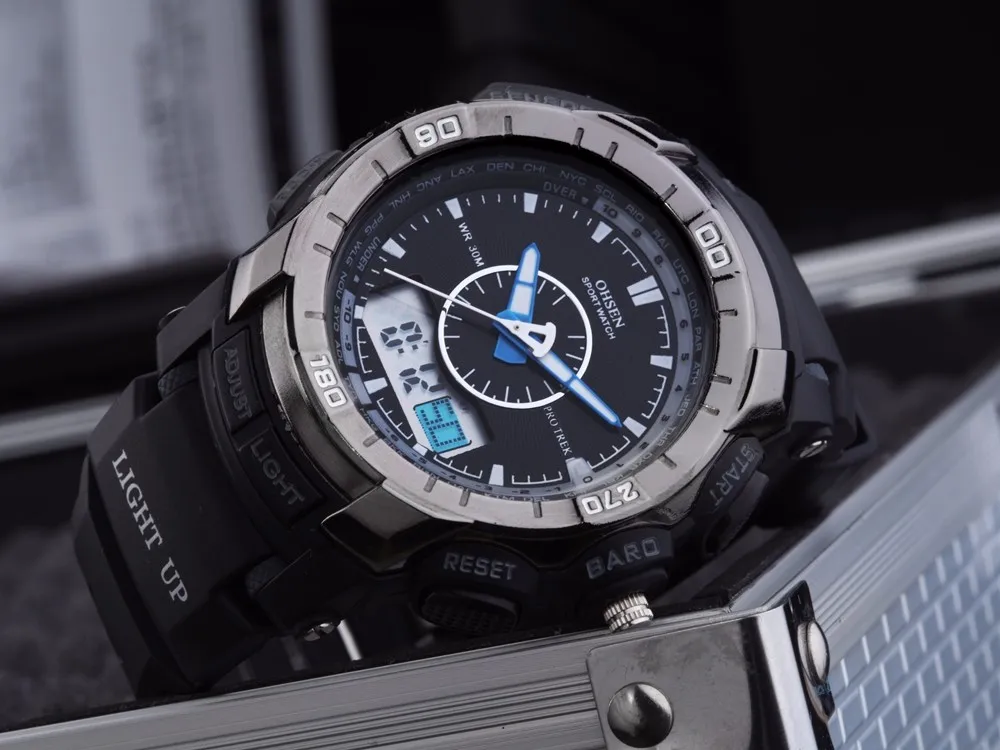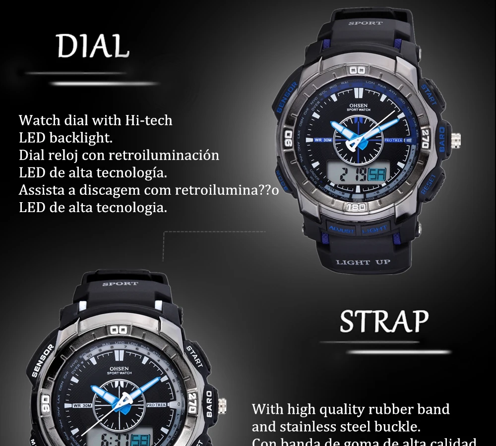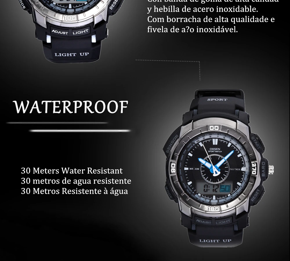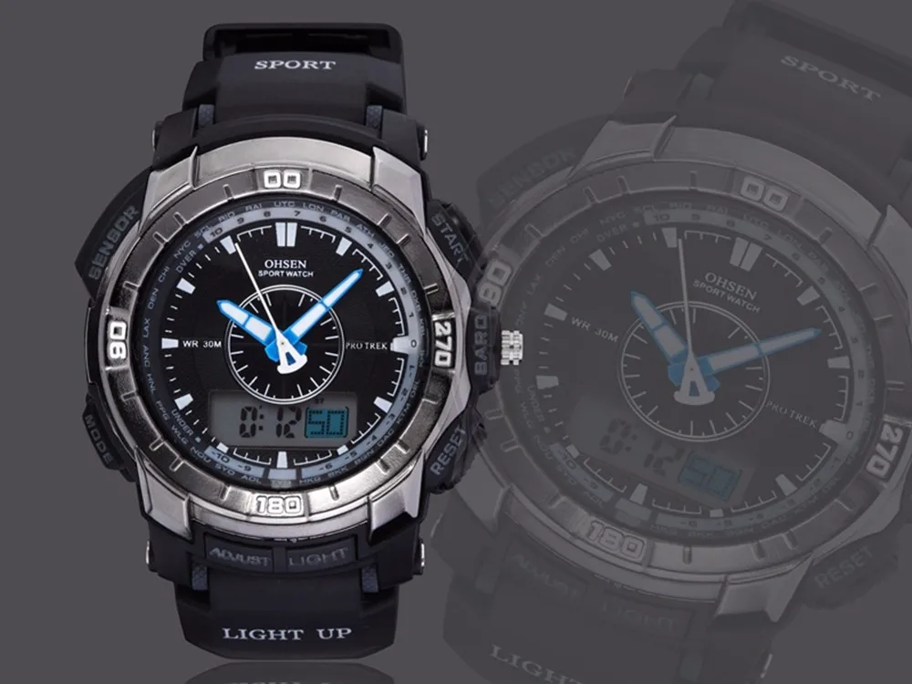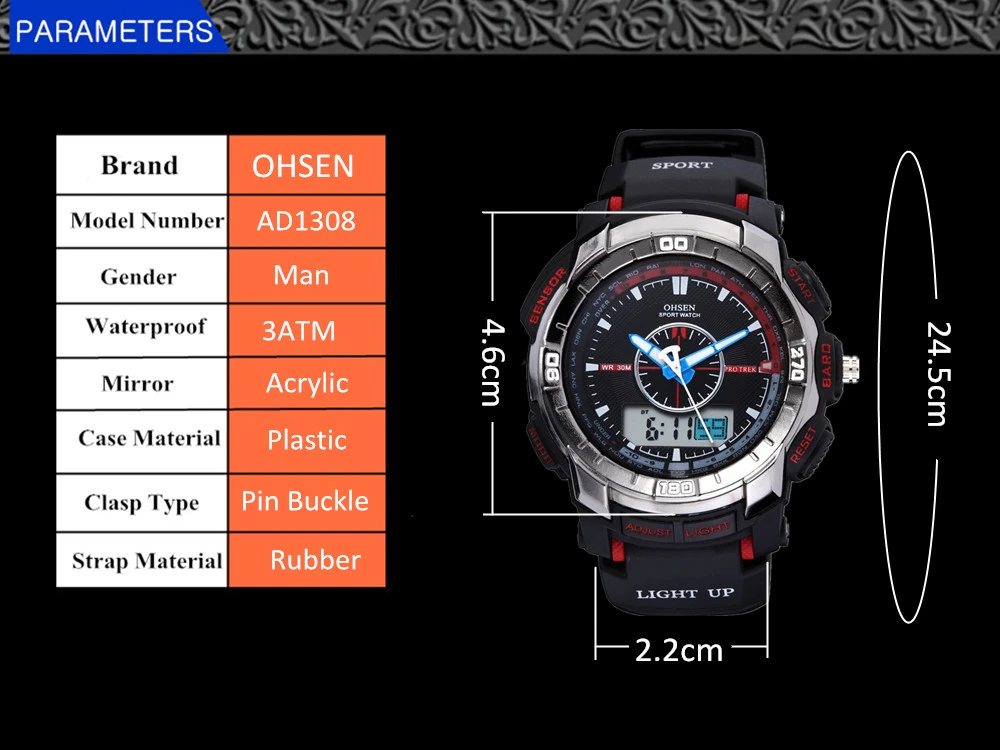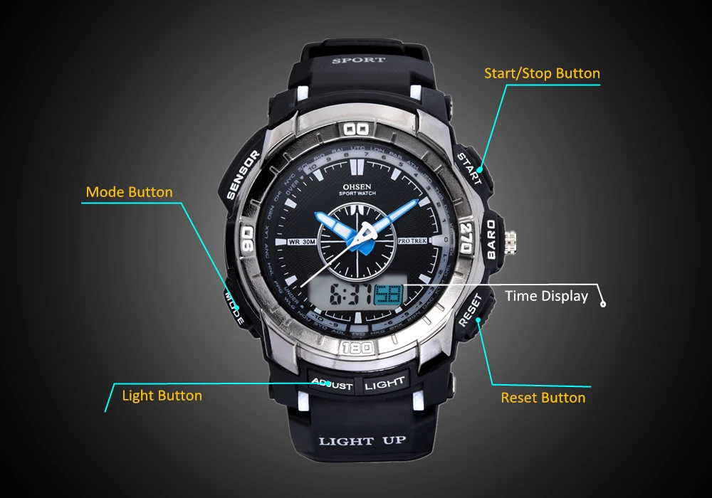 Feature:Alarm,Back Light,Water Resistant,Shock Resistant,Stop Watch,Swim,Multiple Time Zone,Chronograph,LED display