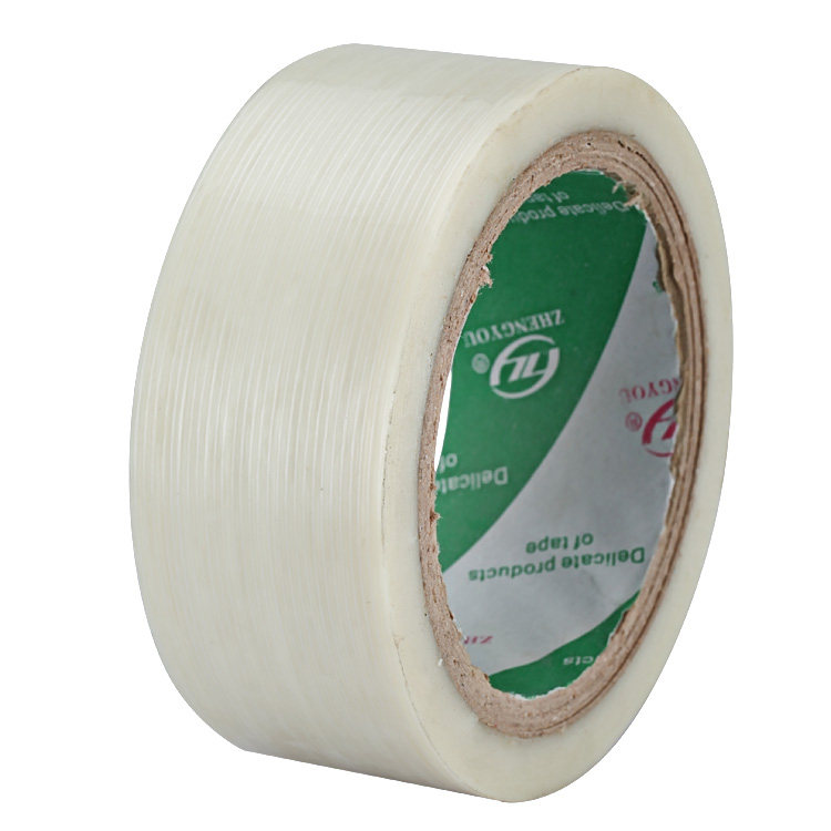 产 品描述:纤维胶带是以PET为基材,内有增强的聚酯纤维线,涂覆特殊的压敏胶制作而成。主要特点:具有极强的断裂强度,优异的耐磨性能及抗潮能力,特有的 压敏胶层具有优异的持久粘力和特殊性能,可以满足各种不同的使用。用途:家电产品包装:如洗衣机,冰箱,冰柜等;金属及木制家具的包装;垫板/纸箱运输; 纸箱包装;零载物品的包装。双面的纤维胶带更适用于橡胶产品的粘贴。