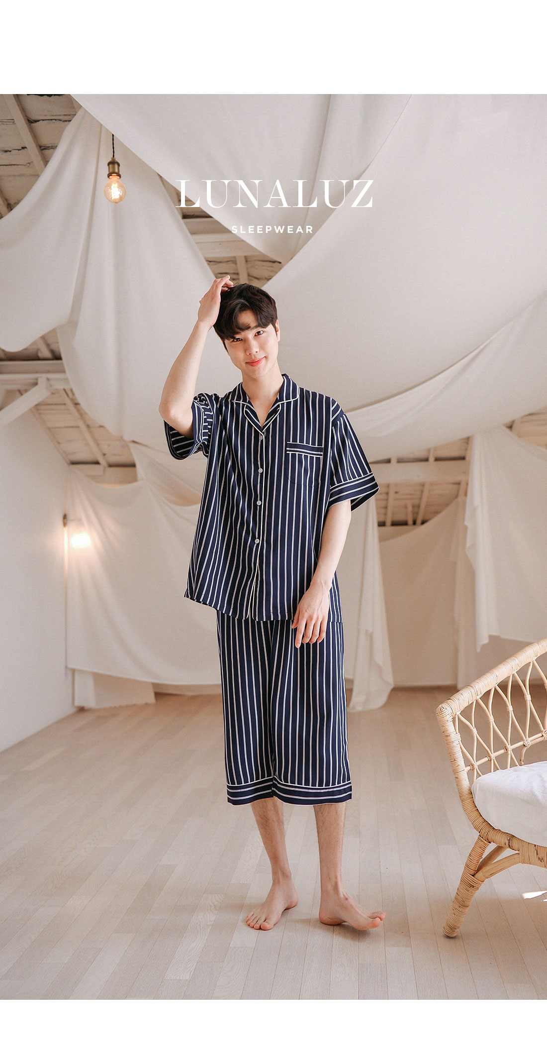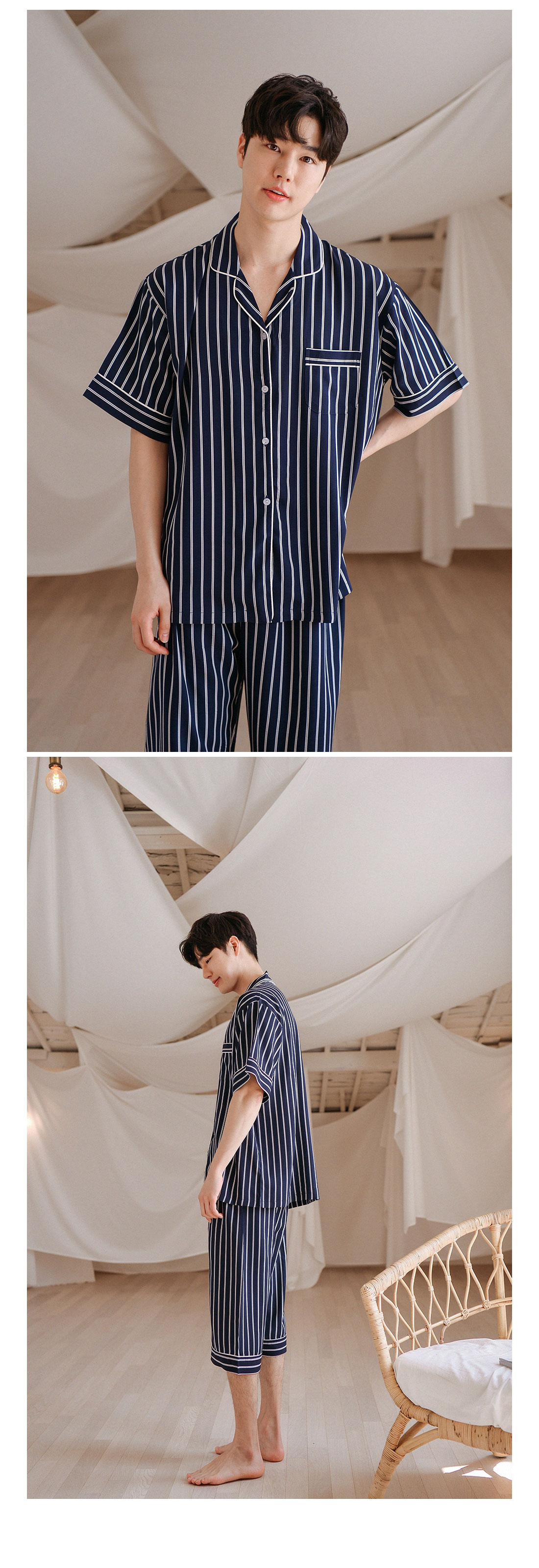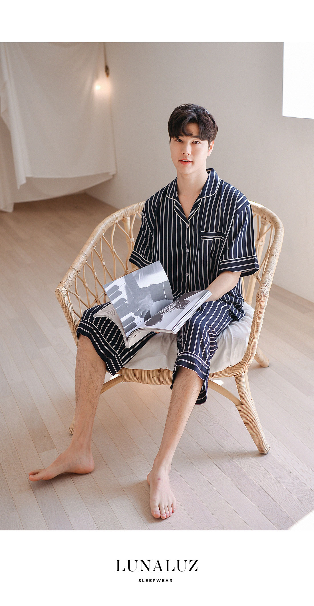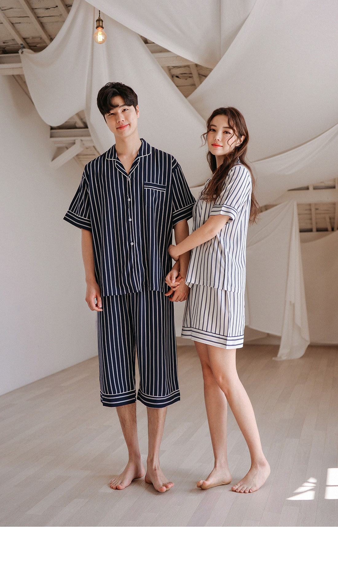 깔끔한 스트라이프 프린팅이 단정하고 클래식한 느낌을 주는 파자마세트에요. 탄탄하고 실키한 40수 레이온 소재로 텍스쳐가 굉장히 좋고, 상쾌하며 숙면을 취하기 좋은 쾌적한 느낌을 만들어 줍니다. 통기성이 우수하고 드레이프성을 가진 소재로 체형의 결점을 보완해주며 슬림한 효과를 준답니다. 질리지 않는 스타일로 계속해서 손이 갈 깔끔한 파자마세트에요. 컬러는 화사한 아이보리, 딥한 네이비 컬러 2가지로 제작 했습니다. DETAIL 깔끔한 포켓 카라 파자마스타일로 군더더기 없는 단정한 느낌의 스타일입니다. 카라의 끝 부분에 네이비 컬러의 파이핑을 클로징 버튼까지 꼼꼼하게 봉제해서 포인트를 주었습니다. 소매의 끝 부분과 3부 쇼츠의 하단 끝 부분에 원단을 잘라 바이어스 처리해서 봉제했습니다. 비침이 거의 없어 더욱 편안하게 연출하기 좋은 파자마세트로 적극 추천해드립니다. 흐늘 거리는 부드러운 소재인 만큼 고난위도의 봉제기법이 들어간 세트입니다. 100%국내 제작으로 소재,디자인,봉제의 퀄리티가 높습니다. SIZE 100size에게 적합한 free사이즈입니다.