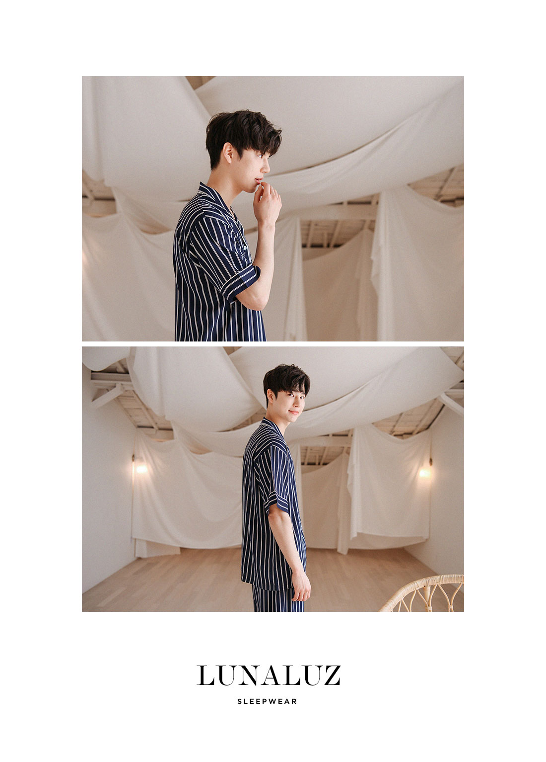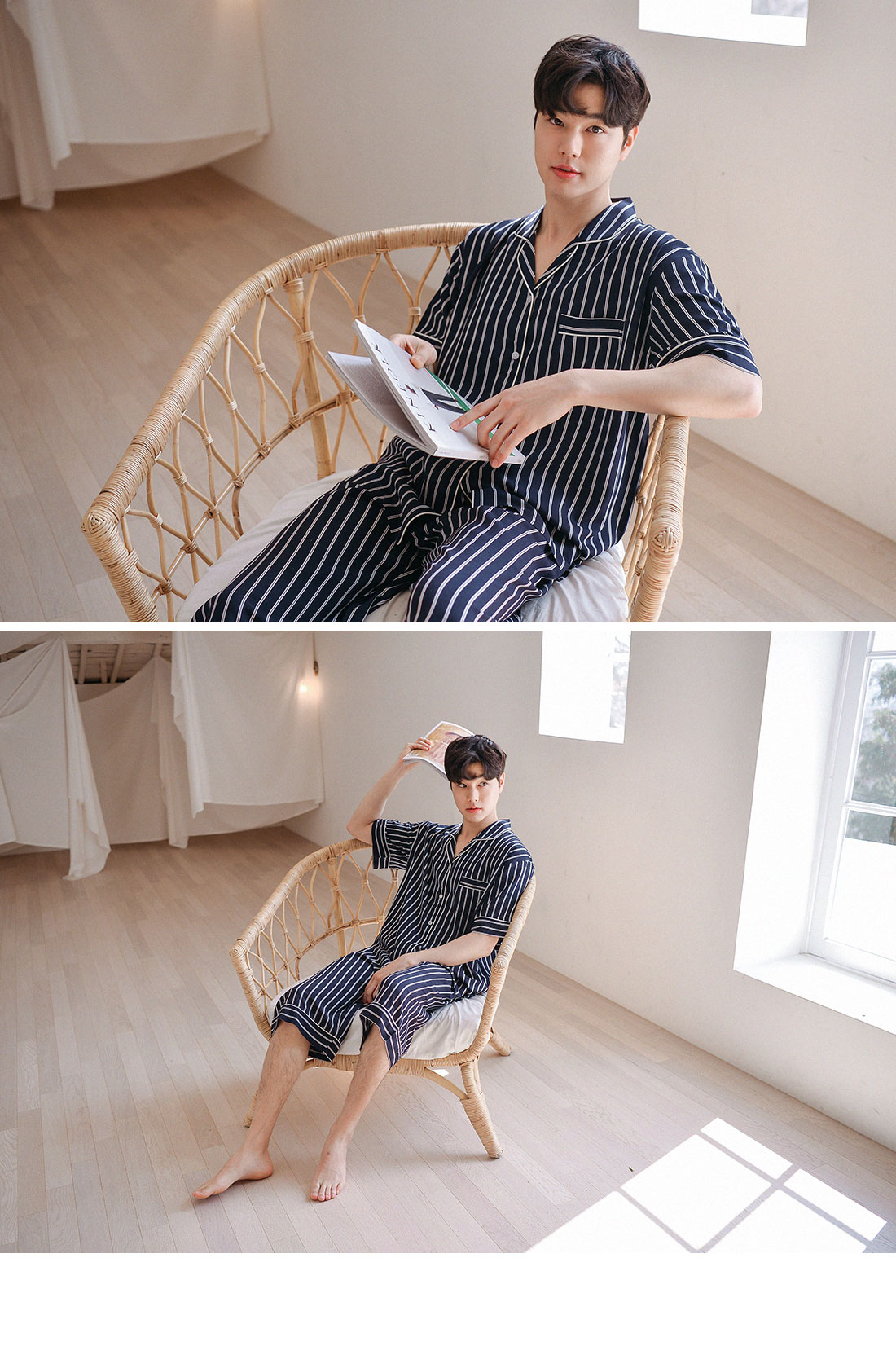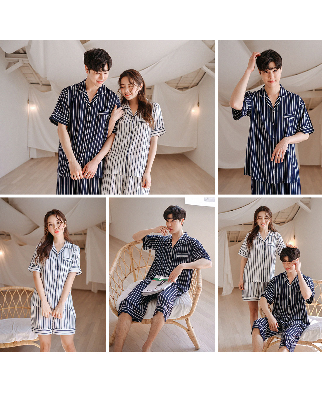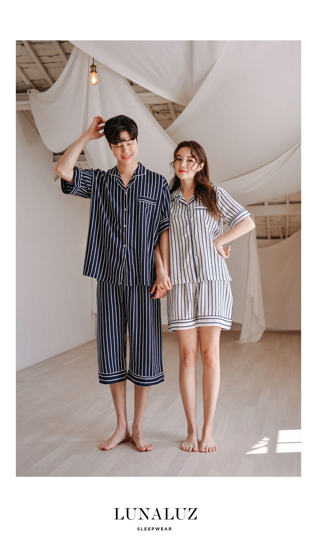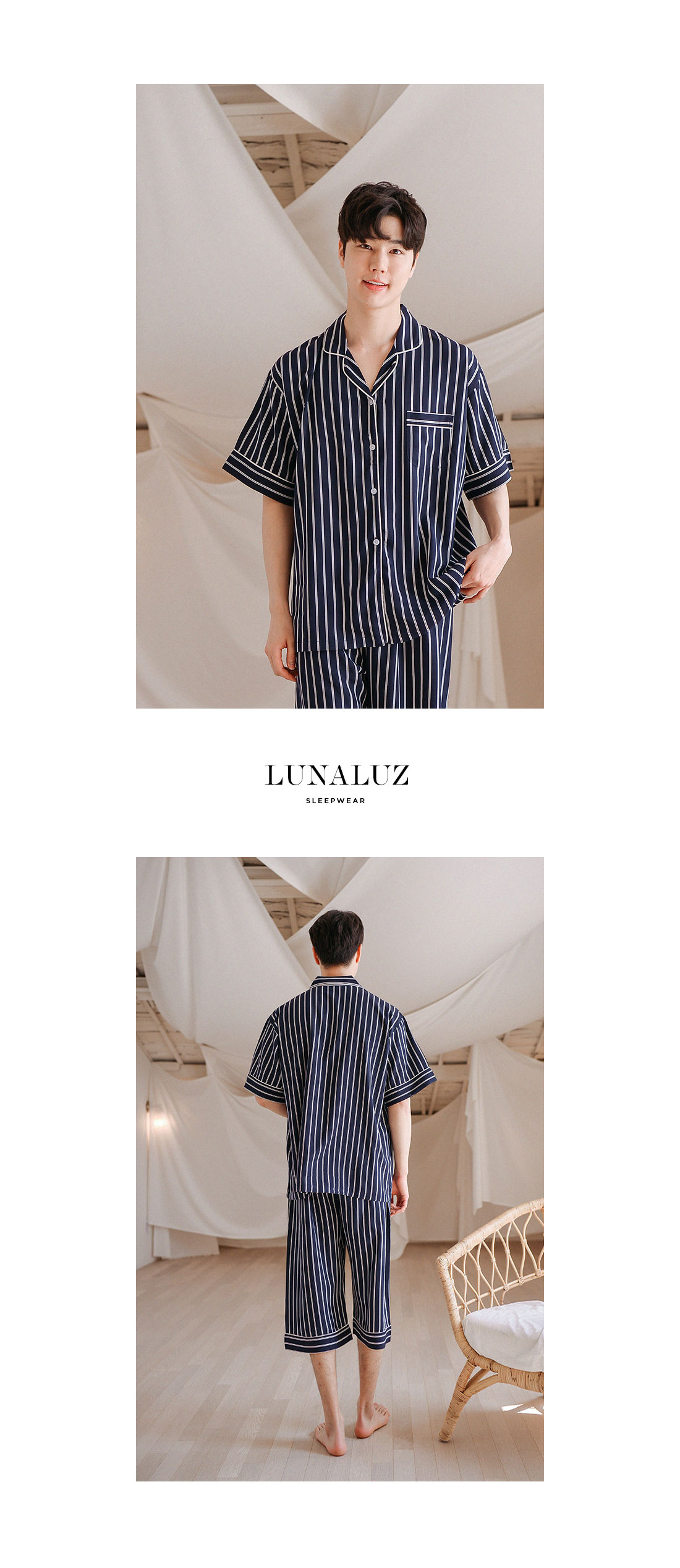 깔끔한 스트라이프 프린팅이 단정하고 클래식한 느낌을 주는 파자마세트에요. 탄탄하고 실키한 40수 레이온 소재로 텍스쳐가 굉장히 좋고, 상쾌하며 숙면을 취하기 좋은 쾌적한 느낌을 만들어 줍니다. 통기성이 우수하고 드레이프성을 가진 소재로 체형의 결점을 보완해주며 슬림한 효과를 준답니다. 질리지 않는 스타일로 계속해서 손이 갈 깔끔한 파자마세트에요. 컬러는 화사한 아이보리, 딥한 네이비 컬러 2가지로 제작 했습니다. DETAIL 깔끔한 포켓 카라 파자마스타일로 군더더기 없는 단정한 느낌의 스타일입니다. 카라의 끝 부분에 네이비 컬러의 파이핑을 클로징 버튼까지 꼼꼼하게 봉제해서 포인트를 주었습니다. 소매의 끝 부분과 3부 쇼츠의 하단 끝 부분에 원단을 잘라 바이어스 처리해서 봉제했습니다. 비침이 거의 없어 더욱 편안하게 연출하기 좋은 파자마세트로 적극 추천해드립니다. 흐늘 거리는 부드러운 소재인 만큼 고난위도의 봉제기법이 들어간 세트입니다. 100%국내 제작으로 소재,디자인,봉제의 퀄리티가 높습니다. SIZE 100size에게 적합한 free사이즈입니다.