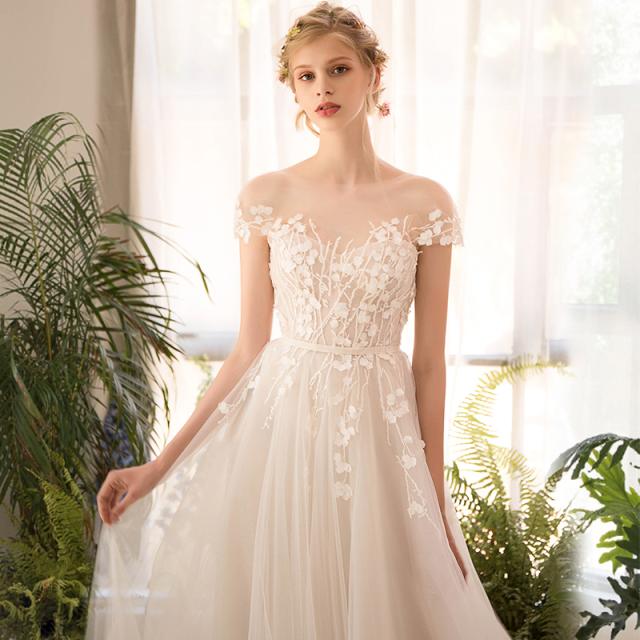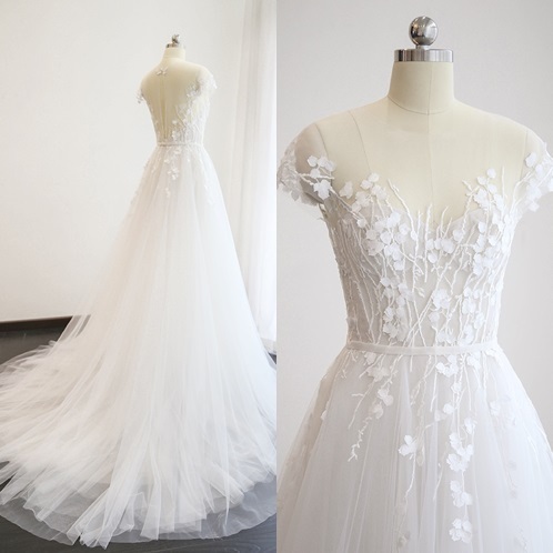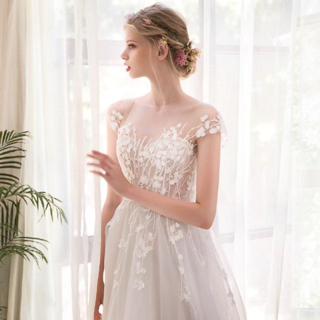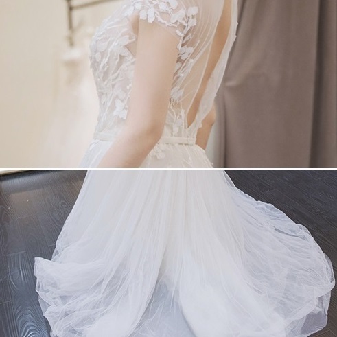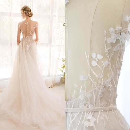 背中をチュールで魅せるマーメイドラインのドレス。