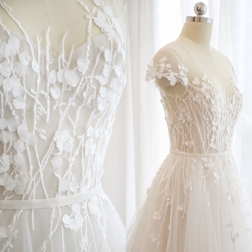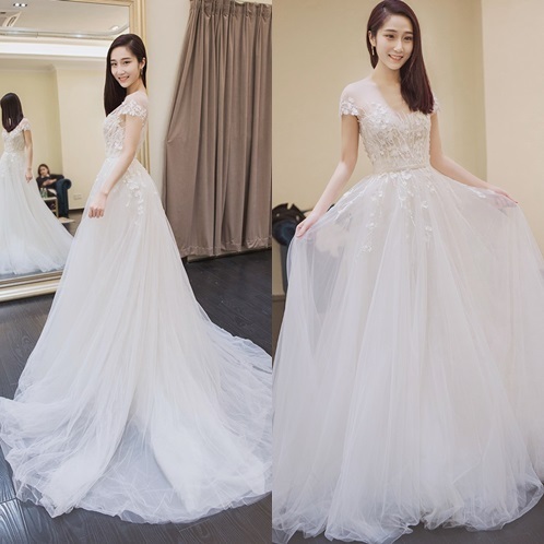 Vラインネックのエレガントなウエディングドレスです。