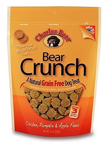 -. Feature : Grain-free dog treats with the light crunch dogs love! / Only 3 calories per treat! / Pocket PerfectTM -- no stains, no smells, no grease, no crumbs in your pockets / Made in the USA with healthy, wholesome ingredients / Convenient 3 flavor sampler -- One 8 ounce bag of each! Each bag has over 350 delicious Bear Crunch Treats.