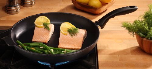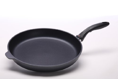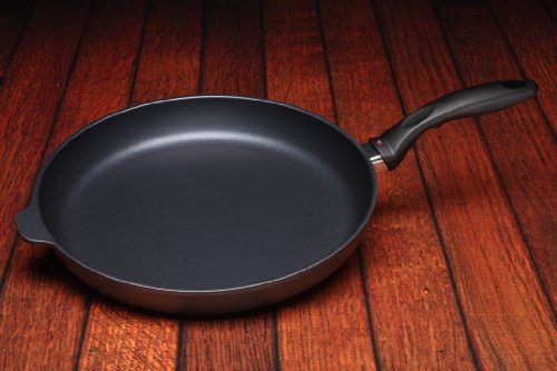 Swiss Diamond's largest fry pan, the 32 cm (12.5”) skillet can accommodate pork chops and other large cuts of meat. The diamond-reinforced coating browns and sears like stainless steel with no-hassle clean-up when the meal is done. Recommended by the American Vegetarian Association (AVA) for vegan and vegetarian recipes, and designed for cooking without added oils or fats, Swiss Diamond can help you reach your health and weight loss goals. A matching tempered glass lid with adjustable steam vent is also available. Used by discerning home chefs around the world, Swiss Diamond’s PFOA-free cookware features unsurpassed nonstick performance for healthy cooking and easy clean-up. The patented nonstick coating, reinforced with real diamond particles, allows oil-free cooking and cleans up with just warm soapy water. No more scrubbing and soaking! Swiss Diamond’s patented nonstick coating is reinforced with real diamonds for excellent durability and resilience. Why diamonds? Three reasons: they are durable, they are naturally nonstick, and they conduct heat better than any metal. A perfect combination for a lifetime of cooking excellence. Swiss quality is visible in every aspect of Swiss Diamond cookware. Heavy-duty cast aluminum will never warp, while the perfectly flat base distributes heat evenly and will not tip or spin. The rivet-free interior prevents unsightly food build-up that can lead to bacterial growth. The ergonomic handle, designed for comfort and balance, stays cool on the stovetop. All Swiss Diamond products are oven-safe up to 500 degrees F (260 degrees C) and suitable for use on gas and electric cooktops – induction series sold separately. Made in Switzerland with an eco-friendly production process.Feature