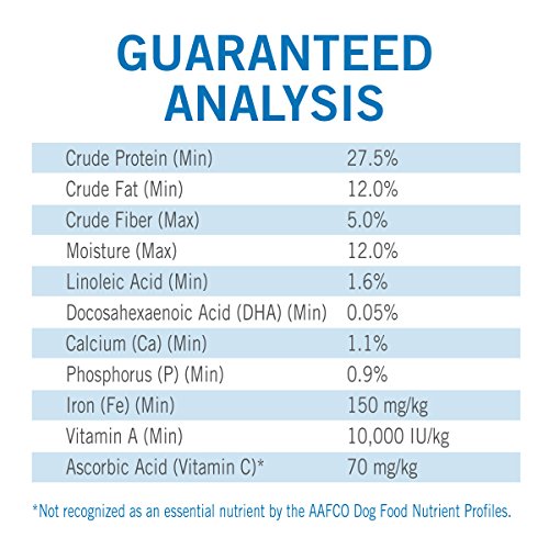 Crude Protein (Min)...27.0%, Crude Fat (Min)...12.0%, Crude Fiber (Max)...5.0%, Moisture (Max)...12.0%, Linoleic Acid (Min)...1.6%, Docosahexaenoic Acid (DHA) (Min)...0.05%, Calcium (Ca) (Min)...1.1%, Phosphorus (P) (Min)...0.9%, Iron (Fe) (Min)...150mg/kg, Vitamin A (Min)...10,000 IU/kg.