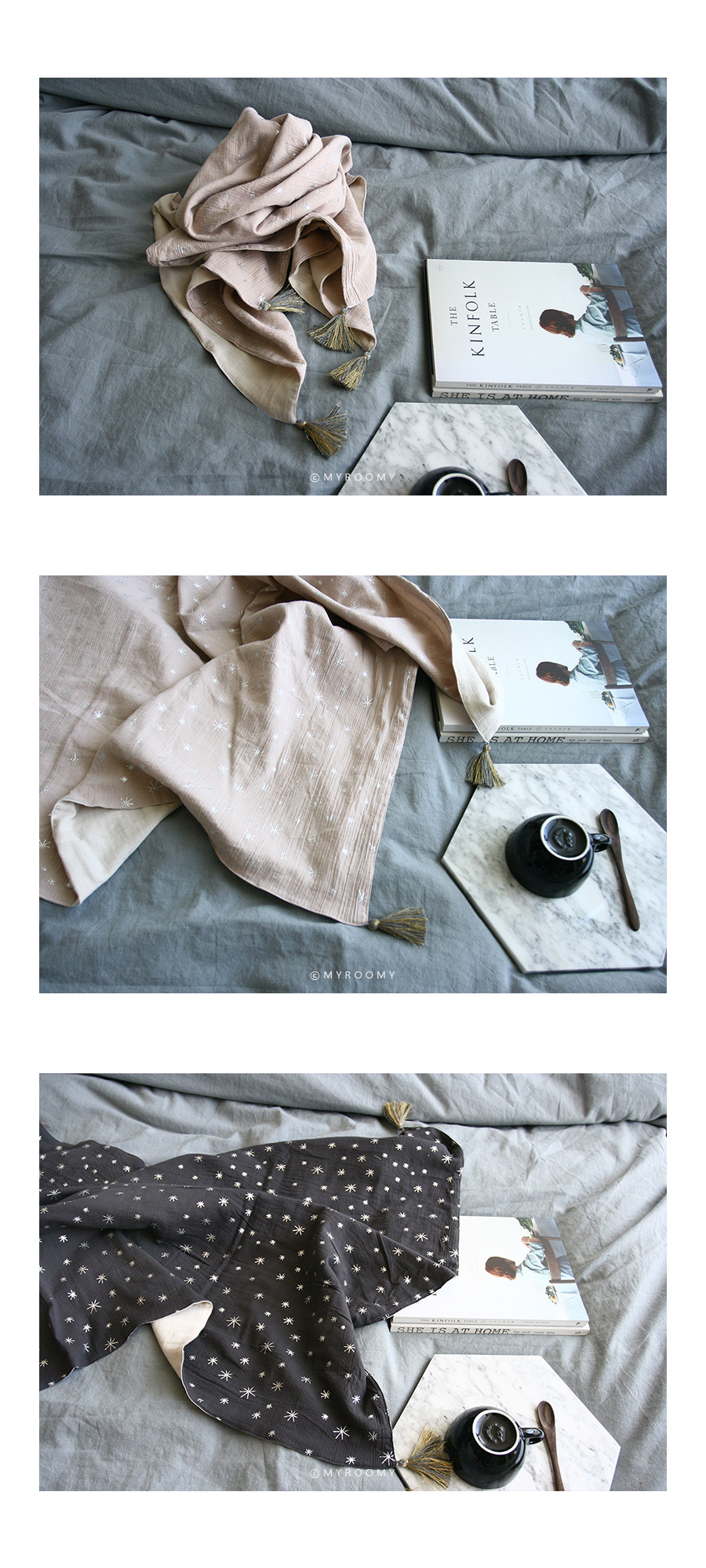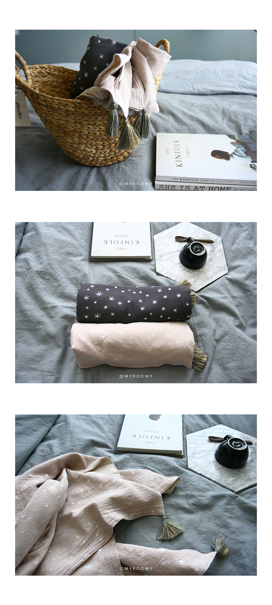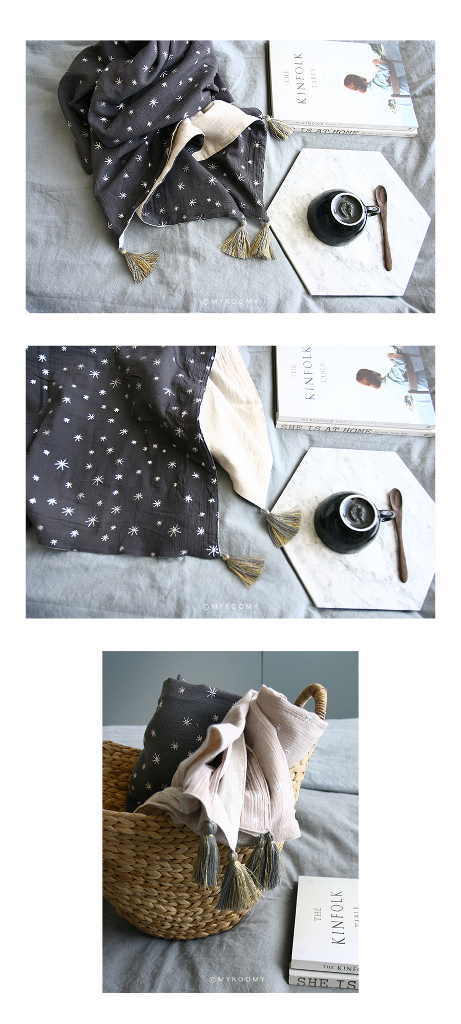 | *주문 제작 상품으로 제작이 들어간 후에는 취소하실 수 없음을 양해부탁드립니다. *세탁 유의사항을 꼭 참고해주세요. *제품 수령일까지는 최소 일주일~10일정도 소요되는 제품입니다. *모니터의 해상도에 따라 실제 제품의 색상과 조금 달라보일 수 있습니다. *제품 상세설명 부드러운 촉감 좋은 거즈 원단에 블링블링 예쁜 실버스타 패턴의 블랭킷입니다. 햇살이나 조명에 따라 은은하게 반짝이는 스타 패턴과 태슬이 너무 고급스럽습니다. 윗면은 리플가공한 1중 거즈, 뒷면은 리플가공한 2중거즈로 제작하여 총 3중 거즈 제품으로 포근한 느낌이 듭니다. 아기들은 유모차 블랭킷, 낮잠이불 용도로 매우 훌륭해요. 특히 유모차 위에 펼쳐서 올려주면 한층 더 유모차가 고급스러운 느낌이 듭니다. 성인들은 쌀쌀한 날씨에 무릎담요로 사용해도 좋고, 숄처럼 살짝 어깨에 둘러도 좋습니다. 소재, 디자인, 활용도등 어느것 하나 빠지지 않는 블랭킷이에요~ 원단 특성상 손으로 세게 비벼빨거나 세탁조에 바로 넣어 세탁시 반짝이는 예쁜 골드스타 패턴이 손상될 수 있습니다. 꼭 세탁망에 넣어 조심히 세탁해주세요. 고온 세탁도 안되어요~~ 세탁부주의로 인한 교환 환불은 안되니 유의해주세요. *제품 상세정보 <<사이즈>> 85*140 170*140 <<구성>> 85*140 170*140 <<색상>> 베이지핑크에 실버스타 패턴/ 태슬: 그레이와 골드 혼합 딥그레이에 실버스타 패턴 /태슬: 그레이와 골드 혼합 <<재질>> 앞: 1중 리플 거즈 뒤: 2중 리플 거즈 <<제작>> made by myroomy <<세탁>> 세탁은 중성세제, 절대 손으로 비벼빨면 안되며, 세탁망에 넣어서 세탁해주세요.ㅣ 울코스로 40도이하 단독 물세탁 권장합니다. |