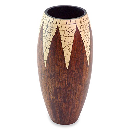 Combining tropical textures, ketut sukayasa conjures a vanilla snow cone. He works in cinnamon sticks and coconut shell on albesia wood for this handsome handcrafted vase.