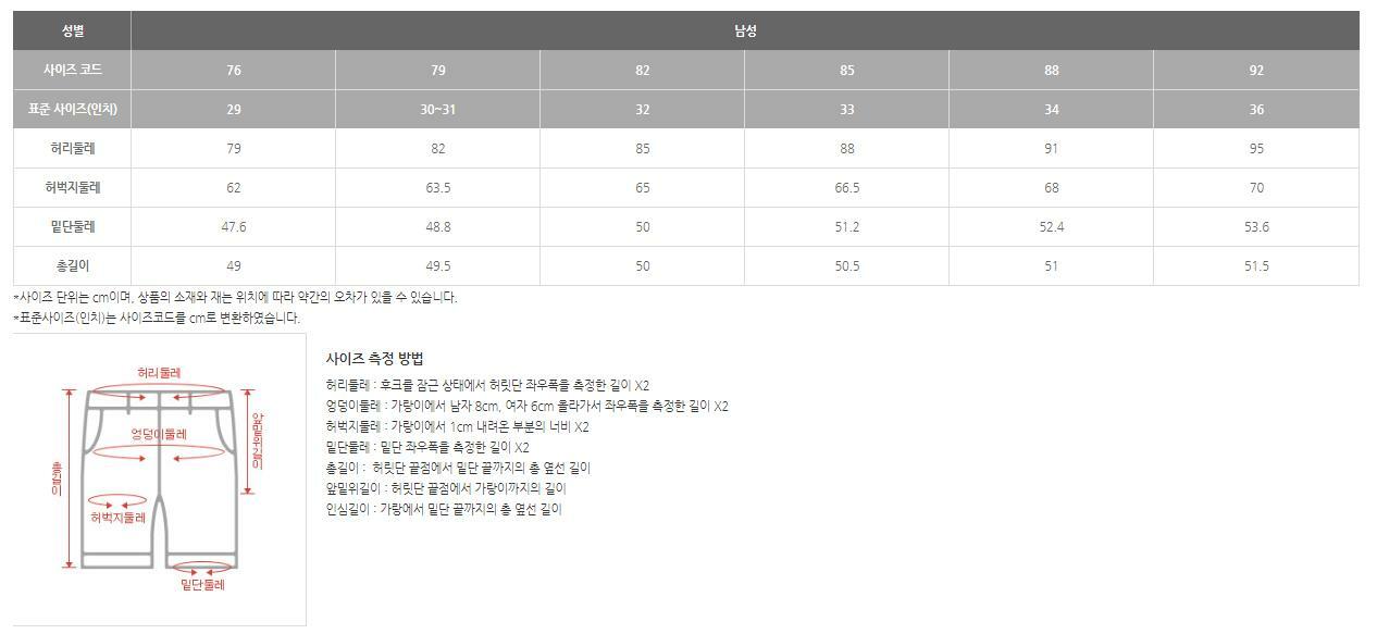 | 치수 | 실측(79)사이즈(cm)-허리둘레81 엉덩이둘레103 총장50 |
