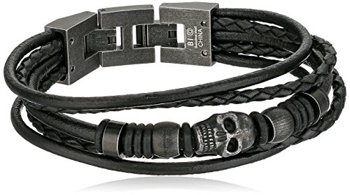 Men's Black Leather with Black Plated Stainless Steel Skull Accent Bracelet