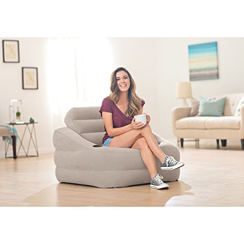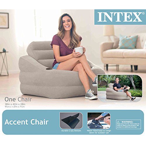 Studio : INTEX Publisher : INTEX Product Description Enjoy some easy livin' in this easy to set up seat, the Intex Khaki Accent Chair. The perfect combo of comfort, simplicity, and style, this chair is great for setting up in the game room or your deck for hanging out in the sun. Fill the base with water to make it extra sturdy for outdoor use. The 2-ply bottom is resistant to scratches, so feel free to set it poolside. The chair has a removable backrest, a cup holder, and a large valve for inflating or deflating it to your comfort level. Sit back and relax in your new Intex Khaki Accent Chair. 0