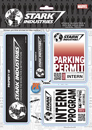 -. Feature : Perfect for use on car windows, laptops, tablets and more / Made of high quality Polyester and then P.R.Inted / Will look great outdoors for a very long time / Features all the items a new Stark Industries intern will need for their first day on the job