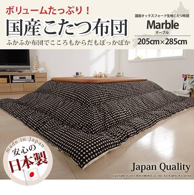 商品について:クッションやカバーにも使われる綿100%の丈夫な国産オックスフォード生地を使用した日本製のこたつ布団です。国内工場で綿入れ・縫製をしたこだわりの一品☆ボリュームたっぷり!すみまでしっかり綿が入ったふっかふかのこたつ布団です。