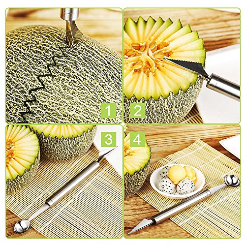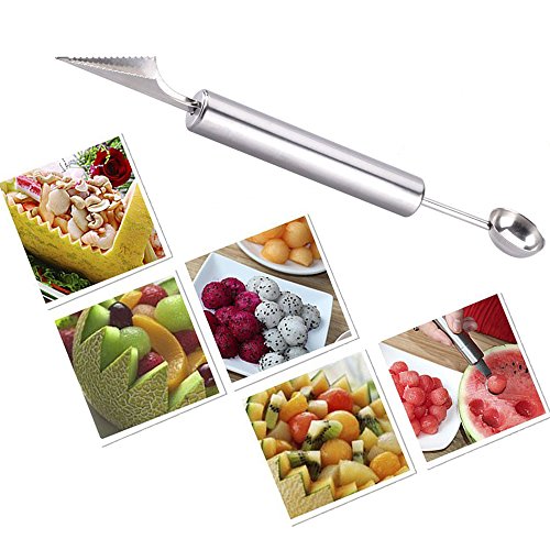 - Double-End Knife Slicer - 2-in-1 Melon Baller/Scoop, one carving knife on one end and spoon on another hand is perfect tool for your kitchen. With carving knife, you can craft fruits according to your preference, especially perfect for preparing a attractive fruit artwork for themed party. Carving melon baller scoop enable you to scoop out uniform balls of watermelon, cantaloupes, ect.