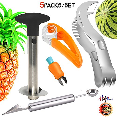 Stainless Fruit Slicer Kit, Fruit Peeler Set-Pineapple De-Corer Peeler,Banana Chopper, Watermelon Slicer, Carving Knife&Melon Baller Scoop and Strawberry Huller(Color Deviation Fruit Slicer Kit)