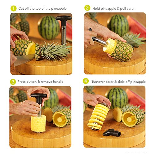 - Pineapple Corer Slicer - Durable pineapple De-Corer peeler stem remover with medium-sized blade is wonderful tools to remove pineapple’s corer as well as its peel in a quick, easy and clean way. The hassle of cutting, peeling and slicing keeps you from adopting a healthy eating lifestyle with this slicer set.