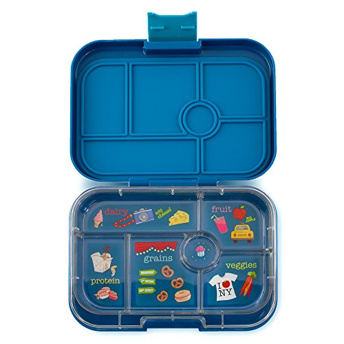 YUMBOX is leakproof! Pack wet foods like yogurt and applesauce (not water). Seals with one lid. Kid-friendly latch. Removable tray with NYC themed illustrations holds five 1/2 cup portions (i.e., 2 1/2 cups plus dip in round well).