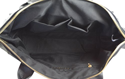 Lined interior flaunts back wall zip pocket and two slip pockets for organization.