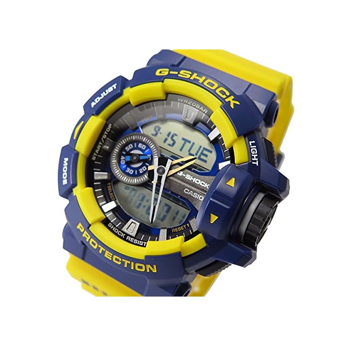Casio g shock casio Men's Women's G-SHOCK navy yellow quartz waterproof casual gift or gifts to the very popular Casio G-Shock G-SHOCK Quartz Men's watch GA-400-9B yellow / navy Casio CASIO G Shock G-SHOCK watch watch casual fashion Casio from G-SHOCK of CASIO, New color of GA-400 which is a combination of rotary switch of the big case and large appeared. It is vivid color ring shine in casual style of spring. Including the band case, dial, put together in one tone to the liquid crystal unit. The index of finishing off a sparkling and shine, hour and minute hands, by placing a ring parts of the rotary switch, added a cool look in the vividness. New toughness design and appropriate color ring to SPRING ~ SUMMER is the emergence of New model fusion. Recommended for gifts and gift. Size (approx) H55 × W51.9 × D18.3mm (lugs, crown excluded), weighing (about) 71 g, arm around maximum (approximately) 20.5cm, minimum (approximately) 14cm Stainless steel (case), the resin ( belt) specification quartz, 20 water pressure, shock structure (resist shock), anti-magnetic watch (JIS1 species), inorganic glass, world time: 48 cities (31 time zones, daylight saving time setting function) + UTC (Coordinated Universal time) time display, UTC direct call function, Home time of urban replacement function, stopwatch (1/100 second, a total of 24 hours, with a split), timer (set unit: 1 minute, set up: 60 minutes, measured in seconds , with elapsed time after time up measurement (60 minutes)), five alarm (with only one snooze function) time signal, full auto calendar, 12/24-hour display switching, Beep ON / OFF switching function, LED light (with auto light, afterglow function, switching afterglow time (1.5 seconds / 3 seconds)), accuracy: average ± 15 seconds per month, LED: amber, color: navy (dial), yellow (belt) Accessories Special BOX, warranty, manual Warranty period 1 year Casio G-Shock G-SHOCK Quartz Men's watch GA-400-9B yellow / Navy