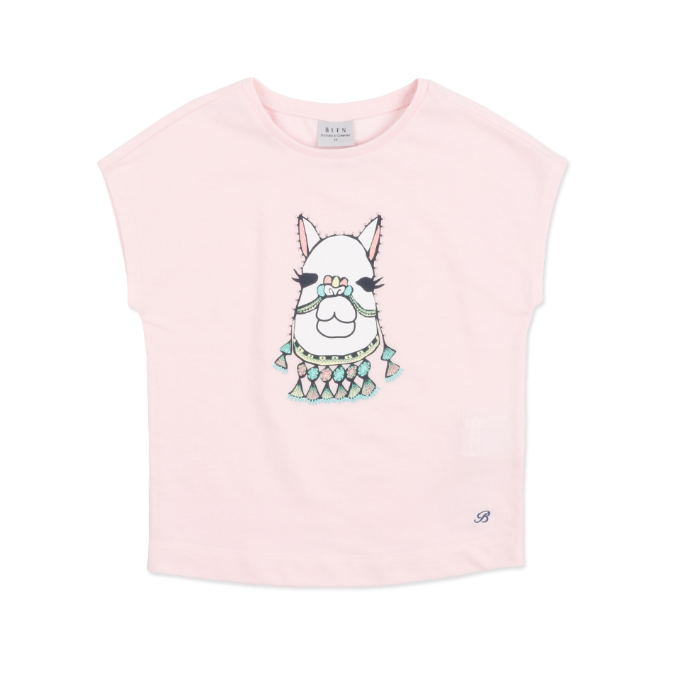 사랑스러운 핑크와 에스닉한 분위기의 반짝이는 라마 프린트가 화사하고, 리조트한 분위기를 보여주는 티셔츠 아이템입니다.