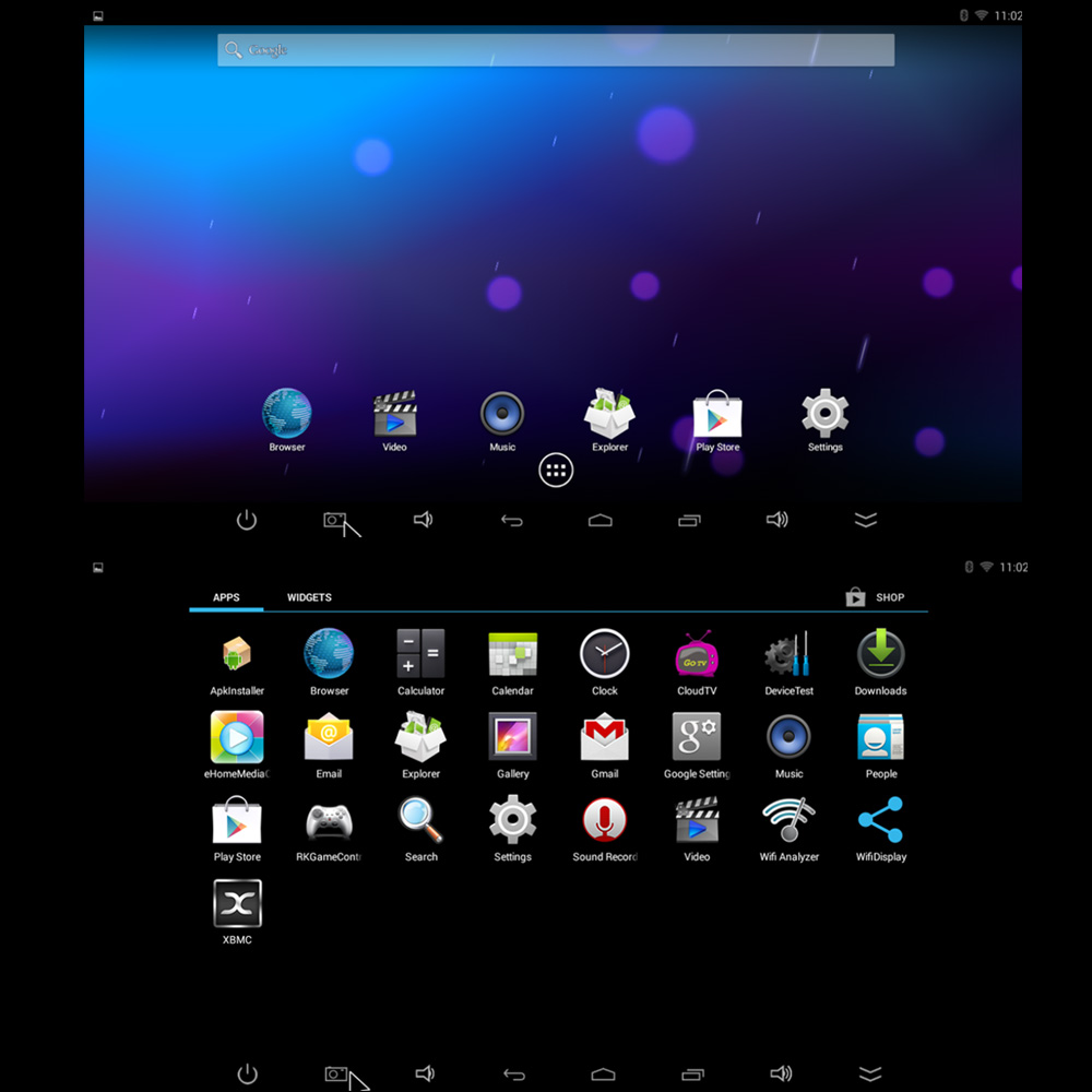 Android 4.4, RK3188T Quad core, 2G DDR3, 16G Nand flash, support 1080P video decoding and output.