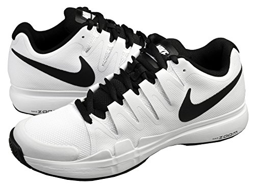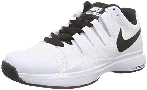 Fit Tip:A?Length - true to size. Width - Medium. Arch - Slightly low. Little to no break-in. The Nike Vapor Tour 9.5 is a great update of Roger Federer's Vapor Tour tennis shoe, in a new color update for Fall 2015. Features a synthetic leather quarter panel overlay and a new Adaptive Fit construction that wraps from the laces to the bottom of the arch for a glove like fit. Mesh throughout helps keep foot cool and comfortable. Nike Zoom buit in the heel with a Phylon midsole for lightweight responsive cushioning. XDR compound on the heel and forefoot in a multisurface, herringbone pattern for long lasting durability and traction. To be worn on tour by Roger Federer.Color: White/Black Midwest Sports only ships Nike products to domestic addresses in the U.S. and U.S. Territories. 0 |