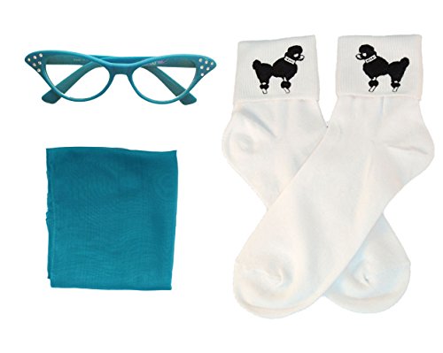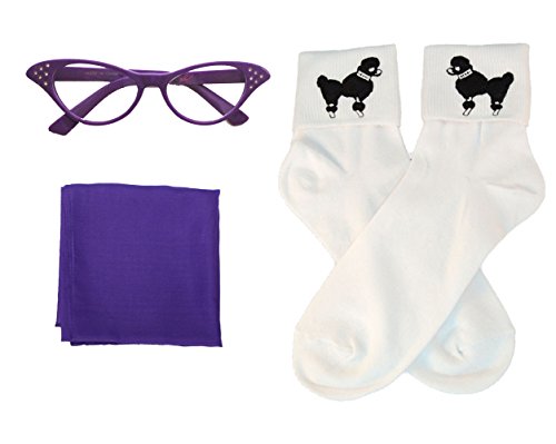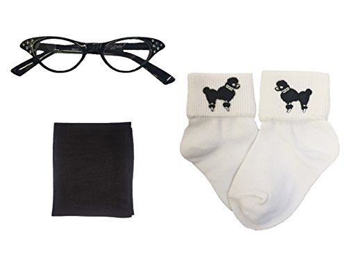 Our 1950s vintage style 3 piece accessory kit comes with a comfortable and light pair of children's Cat Eye Glasses, a sheer silky Chiffon Scarf and a fun pair of Bobby Socks with a poodle appliqué. Offered in a variety of colors to add the perfect touch to any 50s outfit!