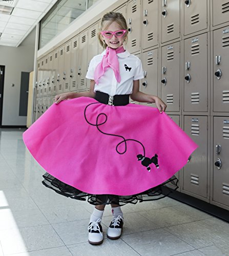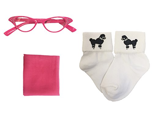 Our 3-piece accessory set is exactly what you need to get the finishing touches on your vintage 50s look all in one order! Our Girls Hot Pink Accessory Set contains a pair of our Vintage 50's style cat eye glasses with rhinestones, white bobby socks with poodle appliqués, and a chiffon scarf all in hot pink for a coordinated look! These vintage frames are composed of an impact resistant, light-weight plastic that looks retro and feels comfortable and is completely safe to wear. We've also accented the corners of the frames with sparkly rhinestones. Plus, our cat eye glasses kids come in a children's size so they won't slip off your daughter's face! Our 50s scarf square is made from a polyester chiffon that is lightweight and extremely soft. And don't worry about dry-cleaning; this one can go right in your washing machine! Our bobby socks complete the 50s costume with poodle appliqués ironed onto each sock. This vintage 50s accessory set is exactly what your daughter needs to complete her 1950s look! We know you'll love our children's 3-piece accessory set from Hip Hop 50s Shop!Feature