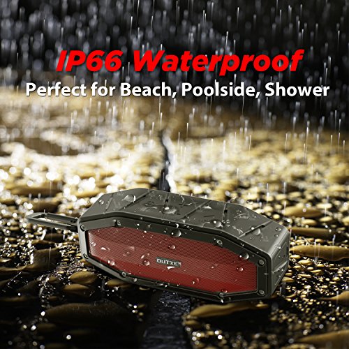 -. Feature : Incredible Battery Life: 27-hour / 500-song playtime at 3/4 volume on a full charge powered by a built-in high capacity rechargeable lithium-polymer battery / Portable Speaker: Just 0.66 pounds (0.3kg) the same weight as an iPad mini. Easily hang it on your backpack with the carabiner, hands-free on the go. Enjoy the streaming music or podcast anywhere. / 2*5W Powerful Speakers: Deep lows, textured mids, and clear highs to enjoy at home or outdoor. / Waterproof Speakers: IP66 Certified Waterproof, Dustproof and Shockproof, resisting water splashes, smashes, sand. Enjoy the music in the shower, in the rain, by the pool or on the beach. / Easy & Hands Free: Easy to sync with all Bluetooth-enabled device as well as devices with a 3.5mm aux in jack. Built-in mic for hands-free calls and worry-free 18-month warranty