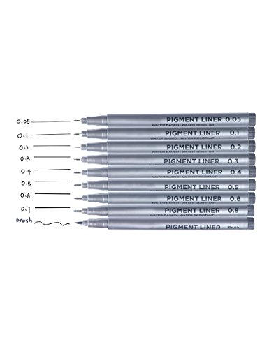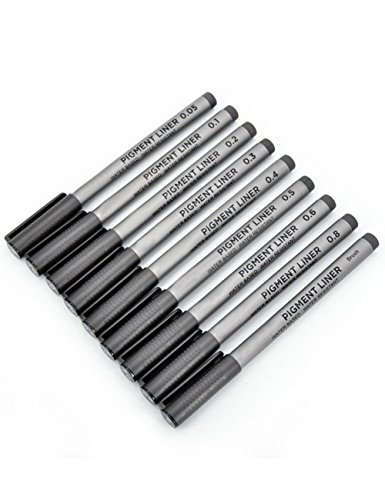 MEEDEN 9 Pcs Pigment Liner Fine Line Pen Ink Pen Set 005 01 02 03 04 05 06 08 Brush, Black