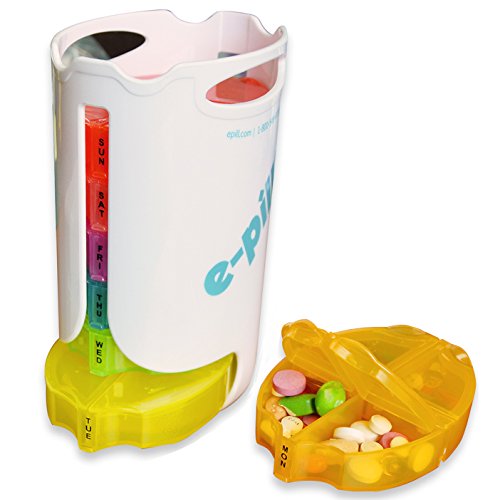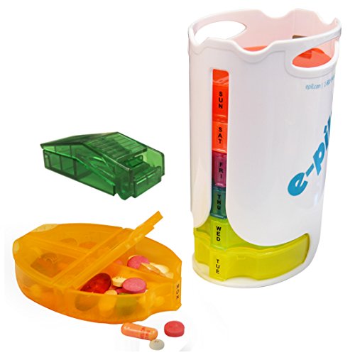 IDEAL: High pill capacity organizer will hold all your medication, vitamins and supplement for one week. 7 colored durable cases labeled Sunday through Saturday, with four large compartments in each. Pill Splitter Cutter included. Each compartment holds 18 Aspirin sized pills.