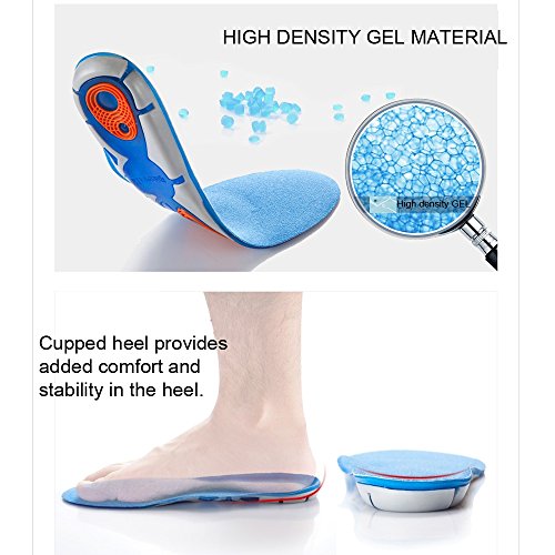 - HIGH QUALITY MATERIAL: Our insole is made of medical grade gel and built specifically to relieve foot pain and aches. Make of GEL+ TPU material which provide more better cushioning effect and comfort, it can absorb shock and reduce stress on feet,good for orthotic.