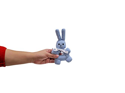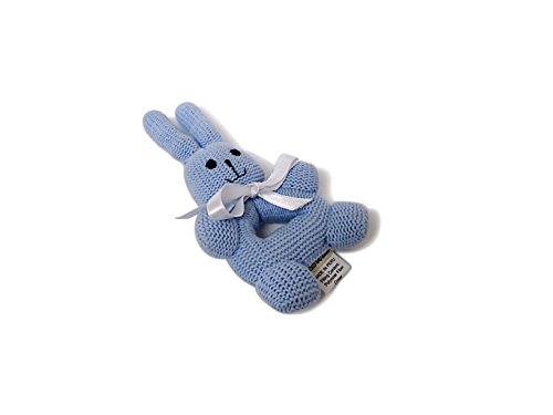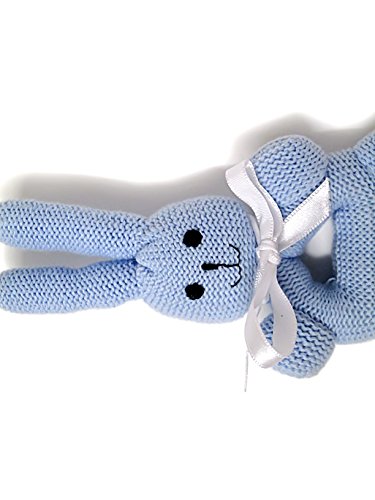 These bunny rattles with handles make the perfect first toy for baby. Part of Estella's hand-knit rattle collection, these round bunnies are available in a soft blue, pink, and gold, are incredibly soft to the touch and easy to hold, and have the most precious hand-stitched smiling faces. These delightful high-quality baby rattles are great gifts for boy and girl newborns. Hand-knit. 100% Cotton. BPA Free. Measure Approximately 7" height x 4" width.Feature