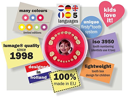 -. Feature : Save your children's teeth in a row, the way they were in the mouth. Place the teeth in the right order by pushing them into the holes in the special Firsty-foam. / Compact round and lightweight housing that fits in a child´s hand. Sturdy, transparant and easy-to-use lid with bayonet catch to protect the collected teeth. Also available in 4 other colours and in favorably P.R.Iced Combosets with 2 or more boxes (see our Amazon-store). / Includes a Logbooklet (4 Pages, full colour, 105 x 75 mm, with lots of space for noting when teeth erupted and came out. With a tell story of 'Sarah and the Tooth Fairy'. Fully in English. Spanish version available on Amazon.MX. / Can hold a small photo of your little one. Includes a Keepsake Disk that is visible on the back of the box. / The ideal Gift for a Newborn or a Child at its 5th or 6th Birthday or when the first tooth comes out.