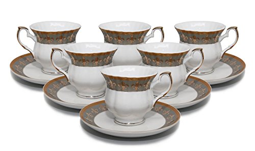 -. Title : Royalty Porcelain 12pc Fleur-de-Lis Tea or Coffee Set, 6 Cups w/ Saucers, 24K Gold-Plated Bone China Tableware